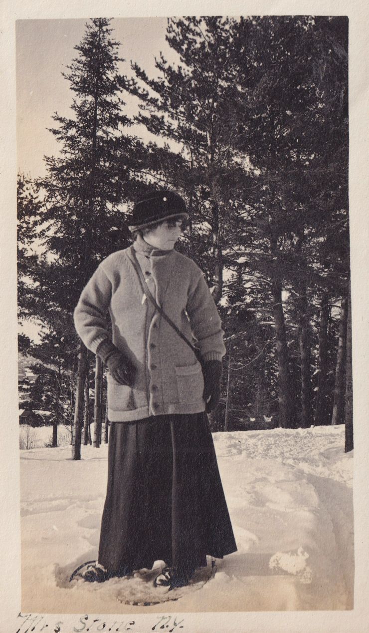 Black-and-white photograph of a woman in winter clothing wearing snowshoes. She is on a snow-covered area with pine trees behind her. There are many other tracks in the snow around her, and what appears to be the start of a path by the trees.