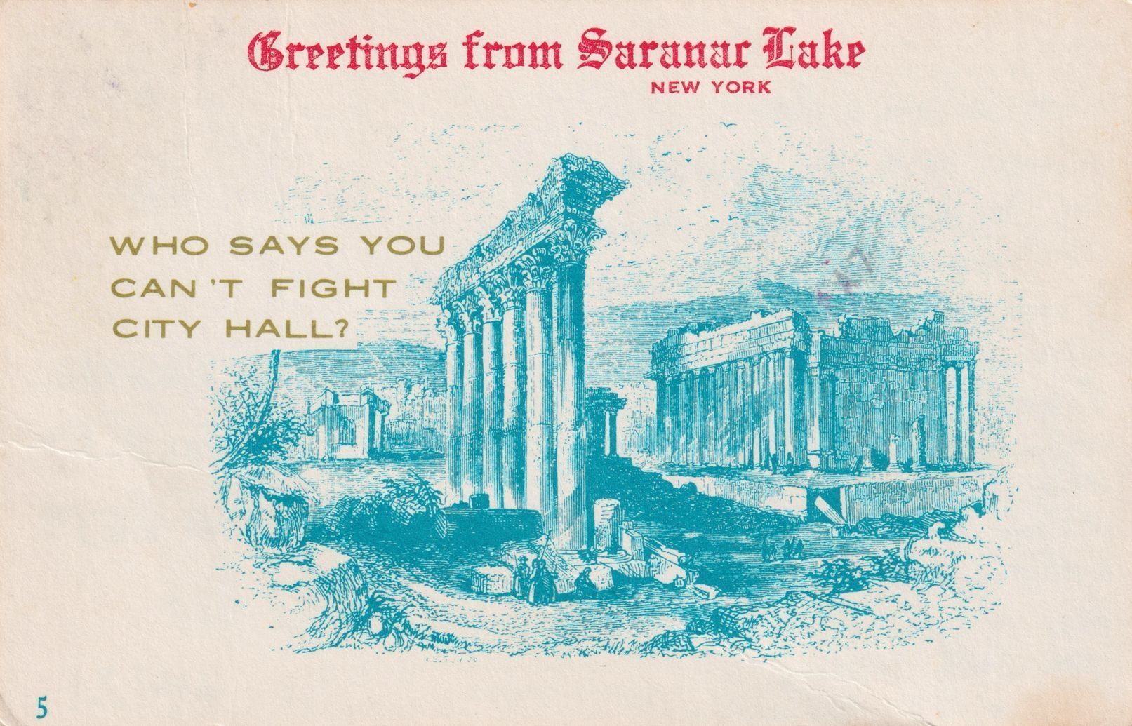 Three-color postcard with illustration of Greek-style ruins. Printed captions on front read, "Greetings from Saranac Lake, New York," and "Who Says You Can't Fight City Hall?" Printed by Village Prints, Baldwinsville, NY. Used, divided back, postmarked Saranac Lake, July 2, 1981.