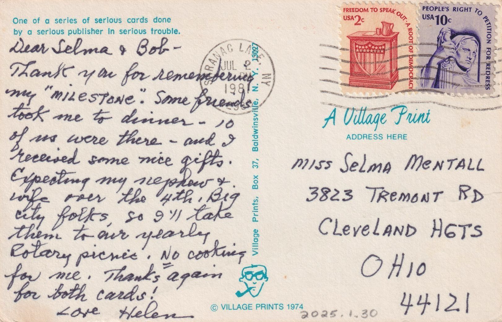 Handwritten message on reverse reads, "Dear Selma & Bob- Thank you for remembering my "milestone." Some friends took me to dinner - 10 of us were there - and I received some nice gifts. Expecting my nephew & wife over the 4th. Big city folks, so I'll take them to our yearly Rotary picnic. No cooking for me. Thanks again for both cards! Love, Helen." Mailed to Miss Selma Mentall, 3823 Tremont Rd., Cleveland Heights, OH 44121.Collection