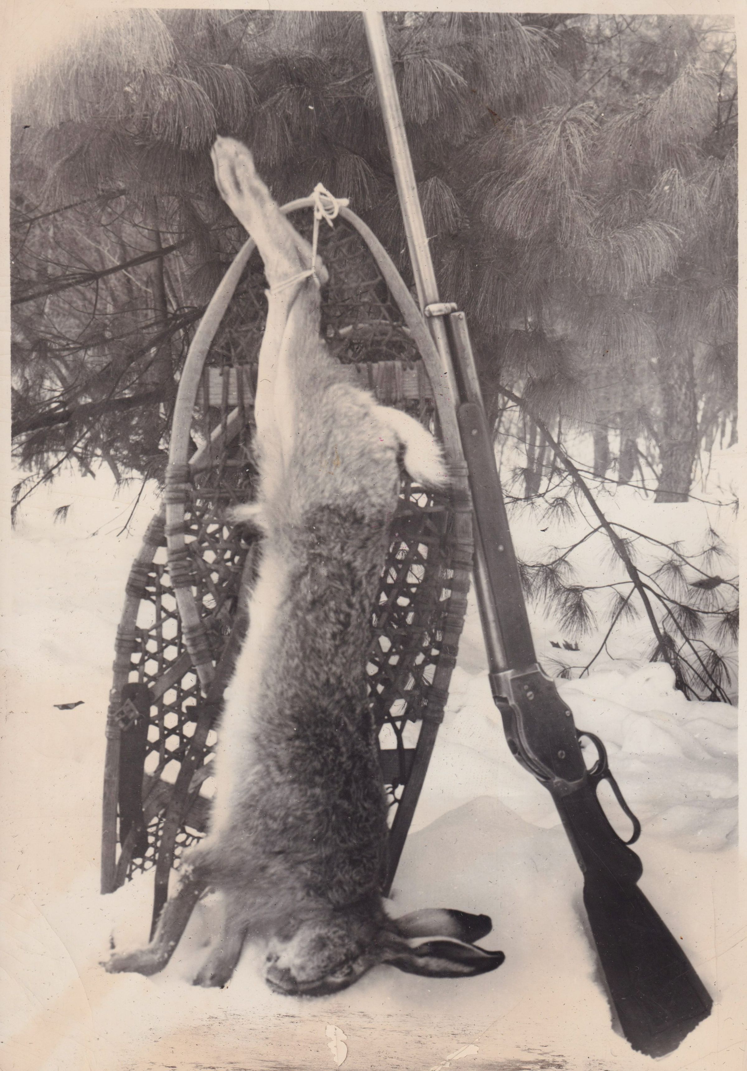 Black-and-White photograph of a dead hare tied to a pair of snowshoes by its back feet. There is a rifle in the snow next to it.