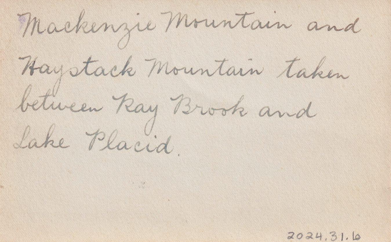 Black-and-White photograph of the view over a fence and across a snowy field. A mountain can be seen in the distance. Handwritten caption on reverse reads, "Mackenzie Mountain and Haystack Mountain taken between Ray Brook and Lake Placid."