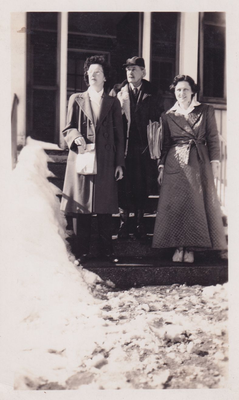 Black and white photograph of two women and one man standing on the front steps of a house. There is snow on the sidewalk leading up to the house and the sides of the stairs. The people are wearing winter clothes.