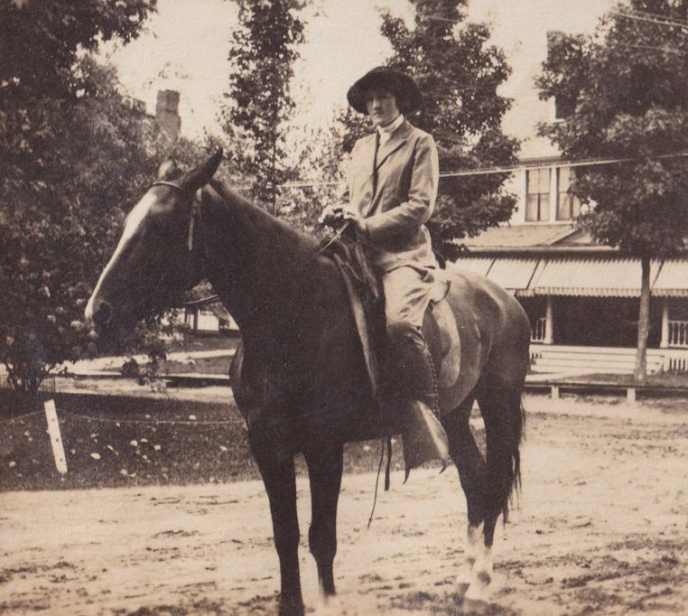 Black-and-white photograph of a woman sitting on a horse on a dirt road. There is a fenced off grassy area and a house with a large porch behind them.