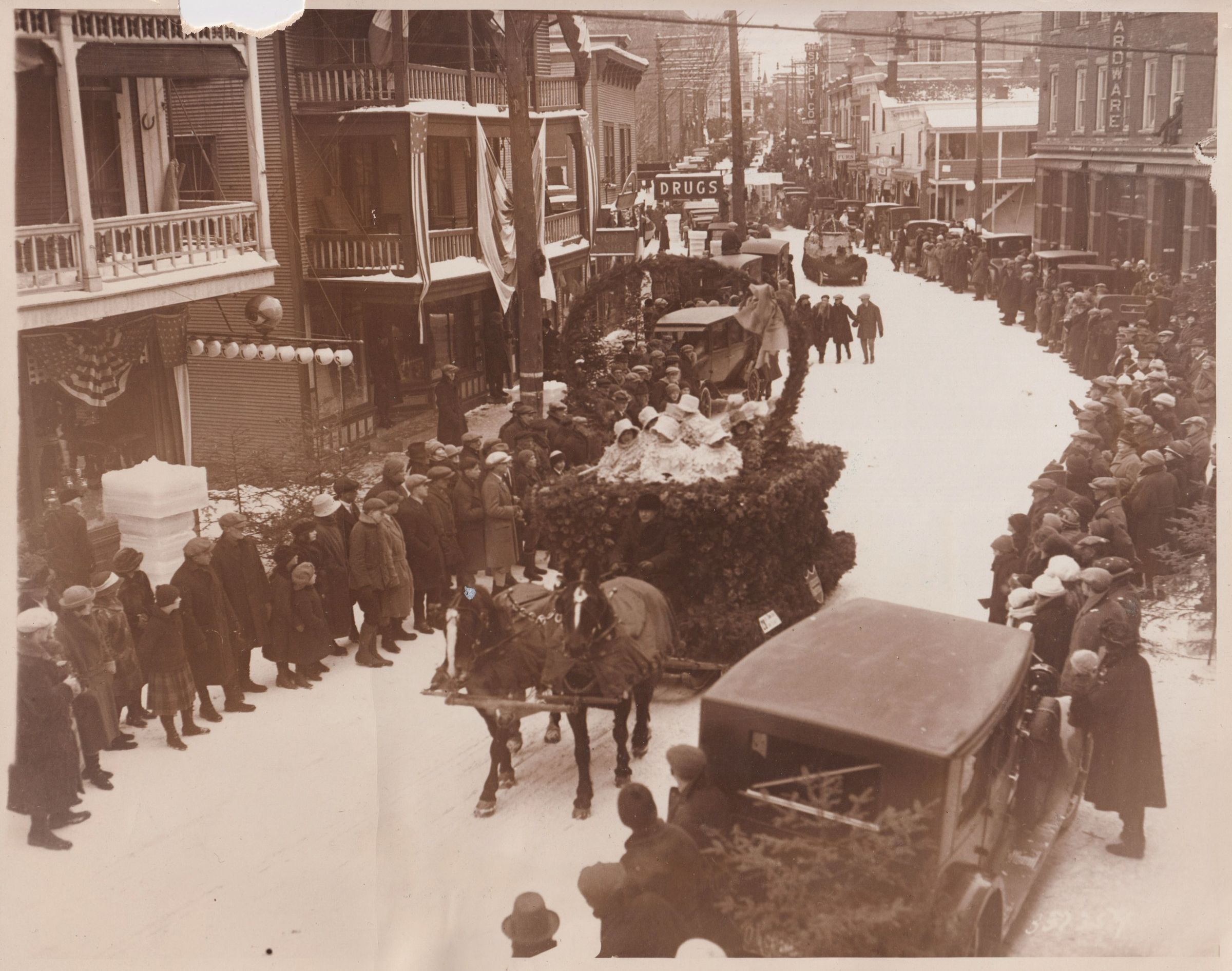 Black-and-White photograph showing floats in the 1924 Winter Carnival parade coming up Broadway between the Saranac River and Main Street. A horse-drawn float with children in white dresses and bonnets is at center. People and cars can be seen lining the street. Photograph by Underwood & Underwood, NY. Caption taped to reverse reads, "Jack Frost Crowned King at Winter Carnival, Saranac Lake: 'Roses that bloom in the snow--American Beauties all--one of the floats in the annual winter carnival at Saranac Lake, in the Adirondacks, NY--held in connection with the national speed skating championships meet. 2/16/24."Photograph Details