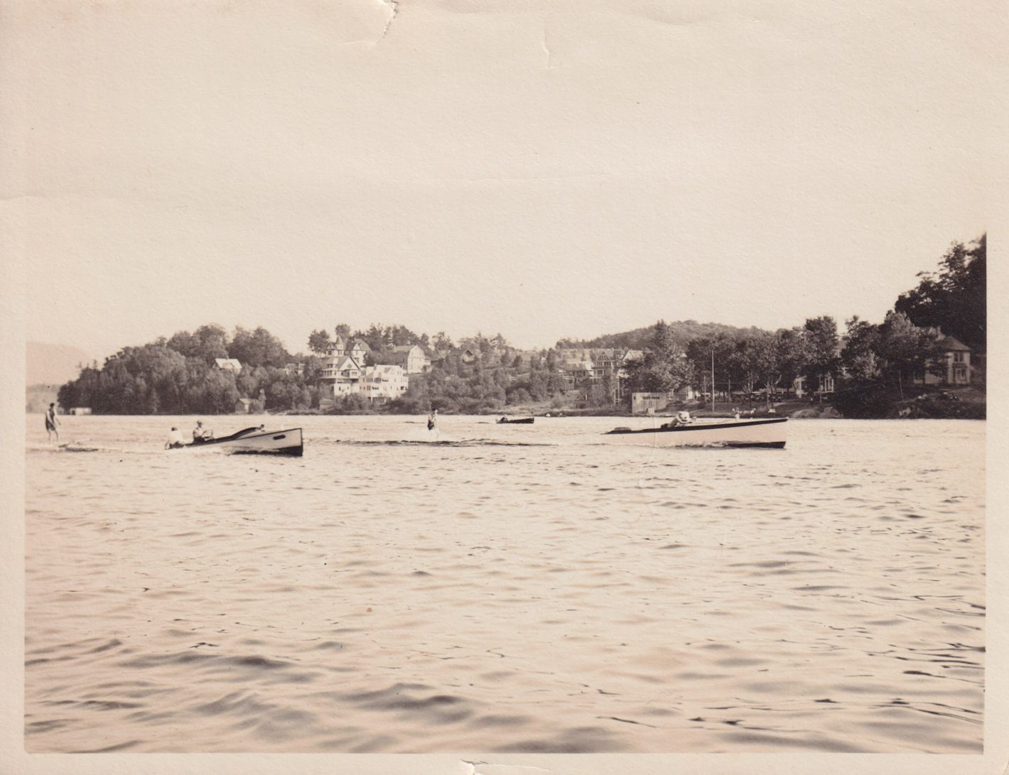 Black-and-White photograph of two boats towing water skiers, possibly on Lake Flower. There are houses visible on the far shore. Photograph may have been taken by William Kollecker, or for Kollecker's studio.