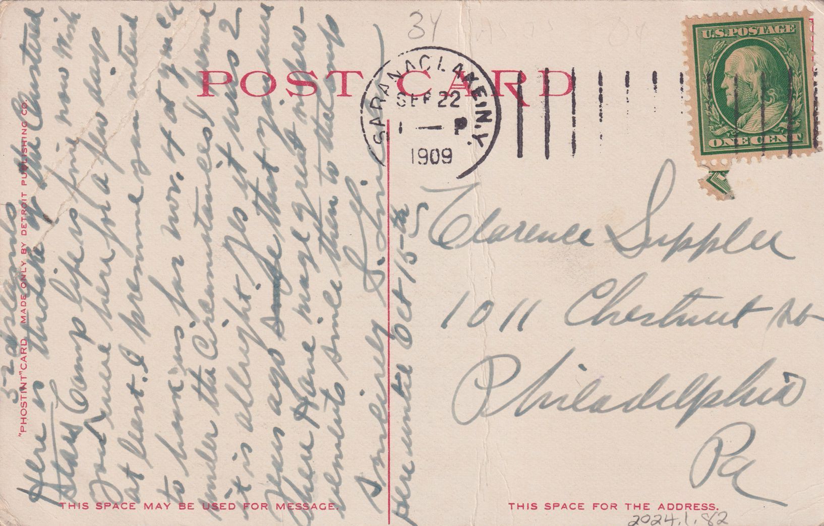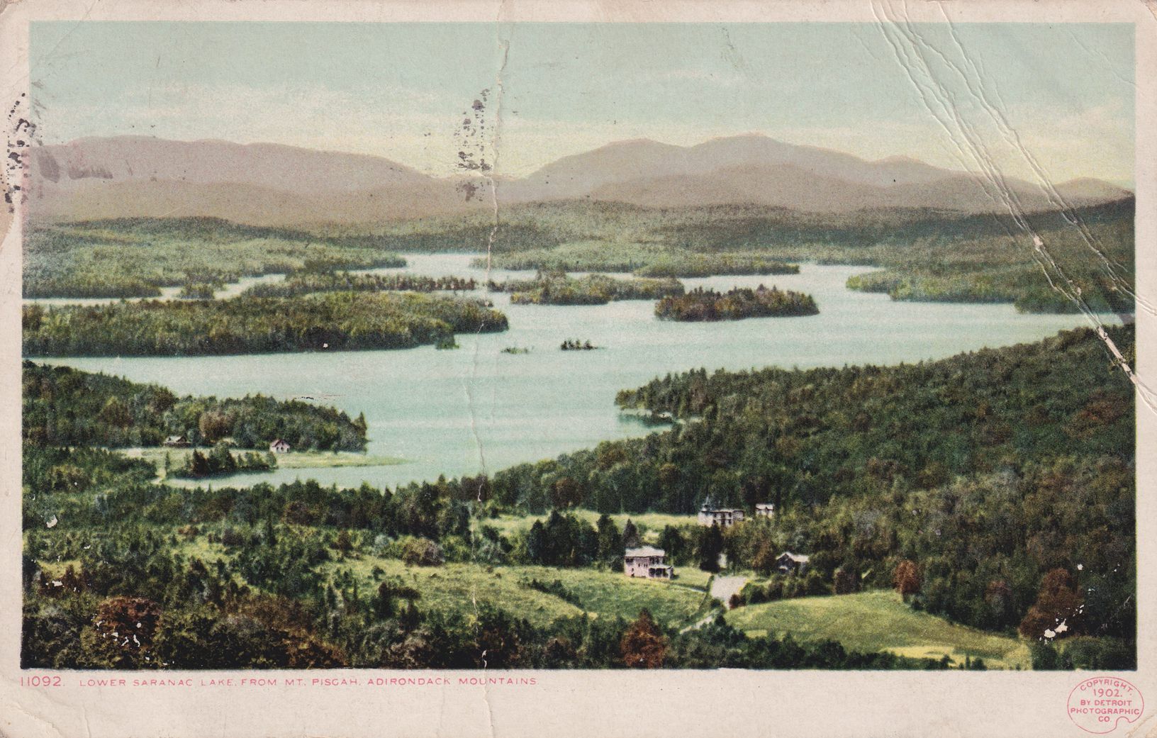Color postcard showing an elevated view of Lower Saranac Lake, looking south/southwest. A few buildings, possibly on Ampersand Avenue, can be seen in the foreground. Printed caption on front reads, "Lower Saranac Lake from Mt. Pisgah, Adirondack Mountains." "Photostint" card printed by Detroit Publishing Co. Used, divided back, white border with small area at bottom for message, postmarked Saranac Lake, NY, September 22, 1909. Handwritten message on back reads, "52 [?]. Here is the Lake of the Clustered Stars. Camp life is fine now. Wish you were here for a few days at least. I presume you intend to book us for Nov. 4 at YMCA. Under the circumstances I presume it is allright. Yes it was 2 years ago that you were here. Have made great improvements since then to the camp. Sincerely, S. Lincoln. Here until Oct 15th." Mailed to Clarence Suppler [?], 1011 Clarence St., Philadelphia, PA.Subject Place