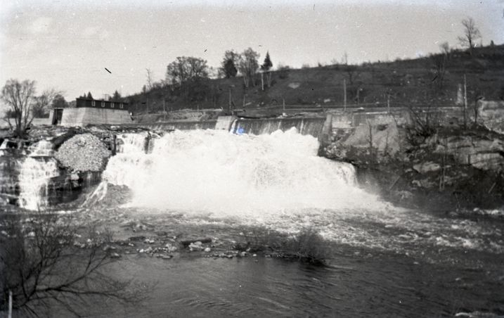Negative of water cascading down a layered rock face, creating lots of white rapids and spray. There is a brick or stone structure next to the falls. Most likely taken by Mary Ives Baldwin. This item is not fully cataloged but has been uploaded so the image is publicly available; if you would like us to prioritize cataloging this item, please contact the HSL Collections team.