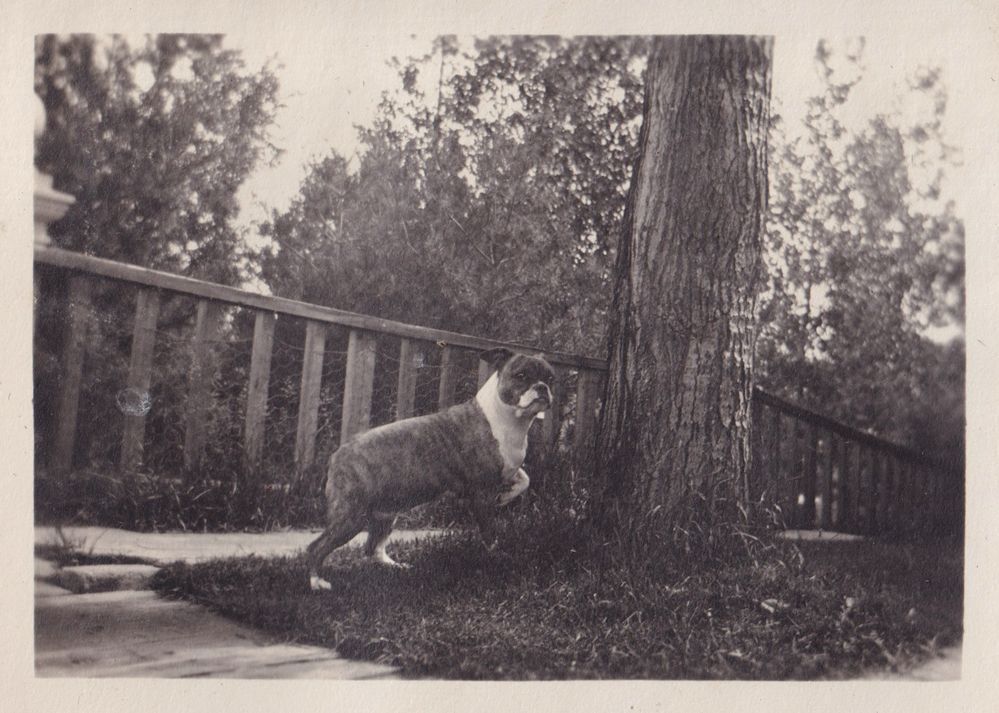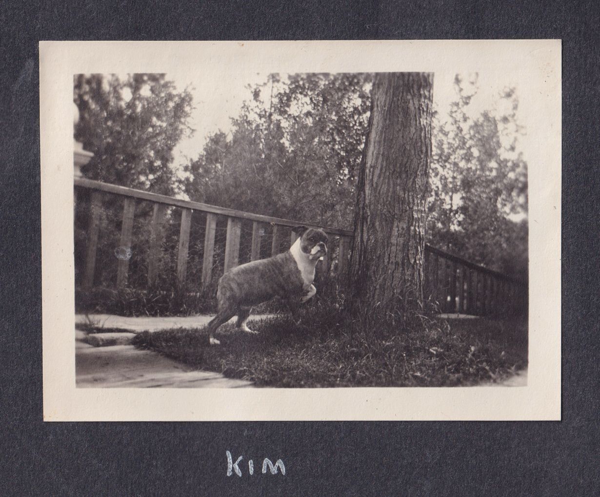 Black and white photograph of a dog standing on a small patch of grass next to a tree. Beneath the photo there is the caption, "Kim."