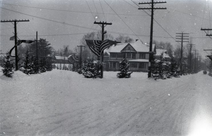 Negative of a snow covered road with American flag bunting hanging from the telephone poles. Most likely taken by Mary Ives Baldwin. This item is not fully cataloged but has been uploaded so the image is publicly available; if you would like us to prioritize cataloging this item, please contact the HSL Collections team.