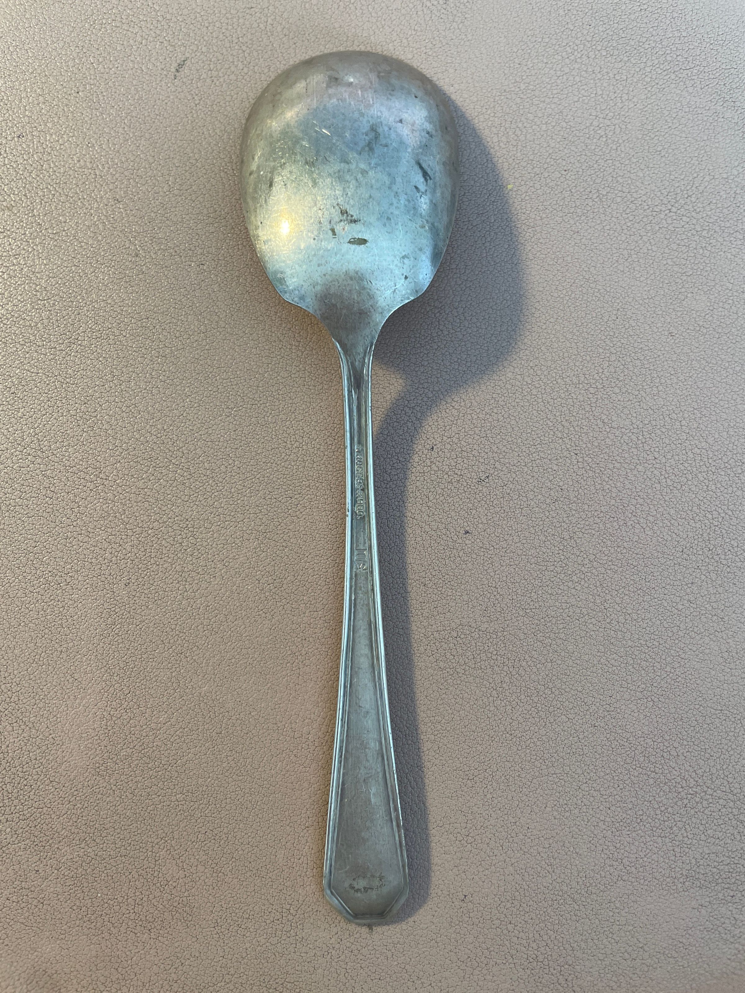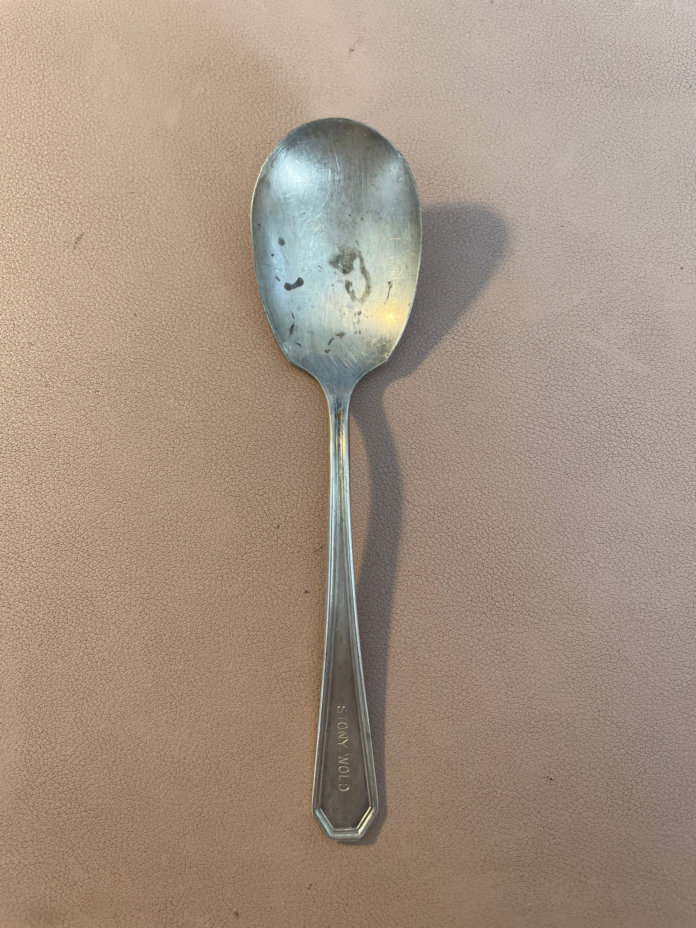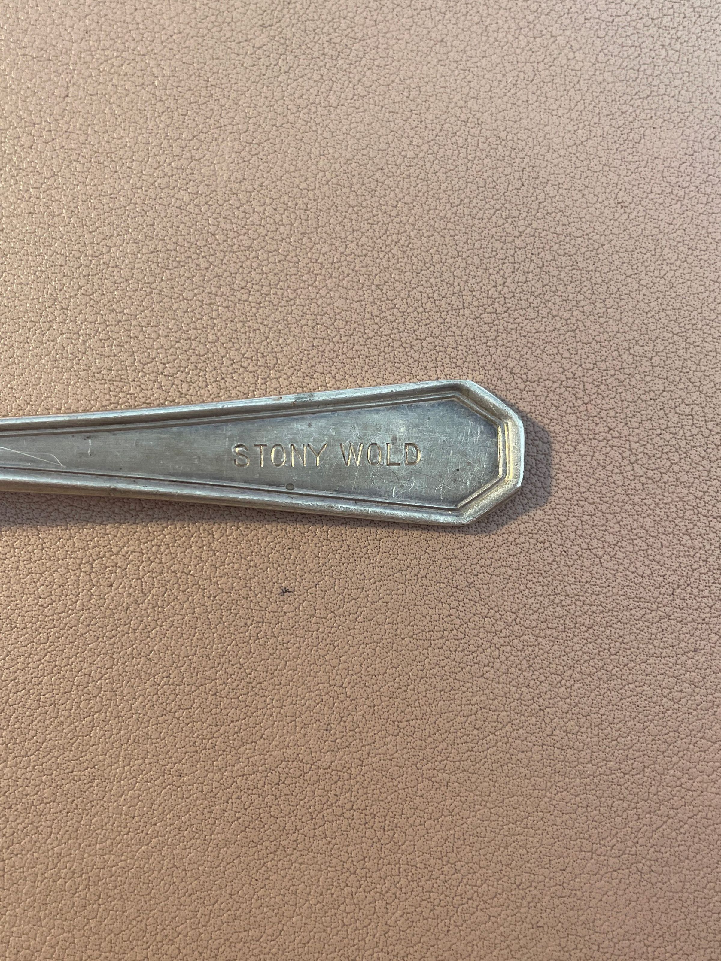 A large silver spoon, possibly a serving spoon, with "Stony Wold," stamped on the handle. Stamped "Rogers & Bro," on back of handle.