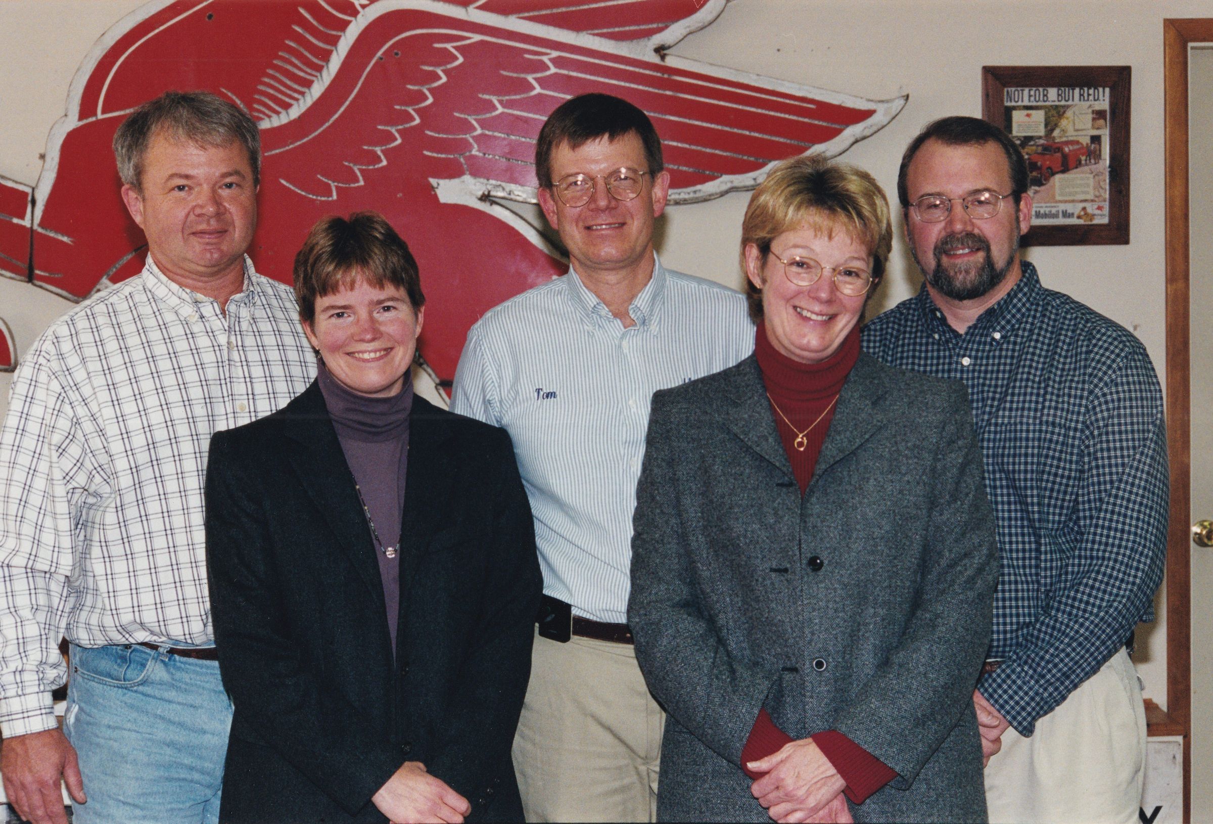 Color photograph of Tom Hyde, Pat Hyde Carnell, Anne Hyde Weller, George Tousley Hyde, and Mark Weller inside of their business, Hyde Fuel. Portrait taken by Mary Lou Hanpeter Banks as part of her Soul Proprietor exhibition.Photograph Details