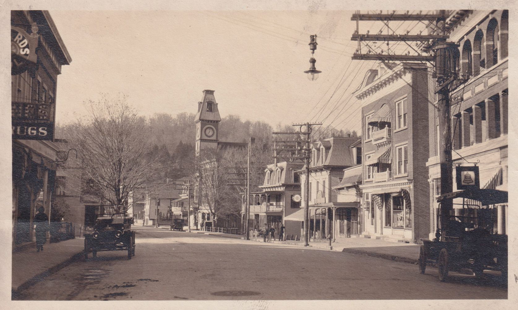 Black-and-White photograph of downtown Saranac Lake, looking south down Main Street toward the original Harrietstown Town Hall. Several businesses are visible along the street, with early automobiles parked out front.