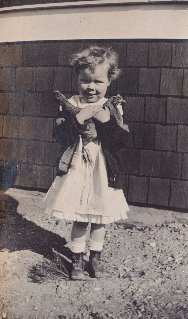 Black-and-white photograph of a young child standing against the siding of a house and holding a chicken in their arms.
