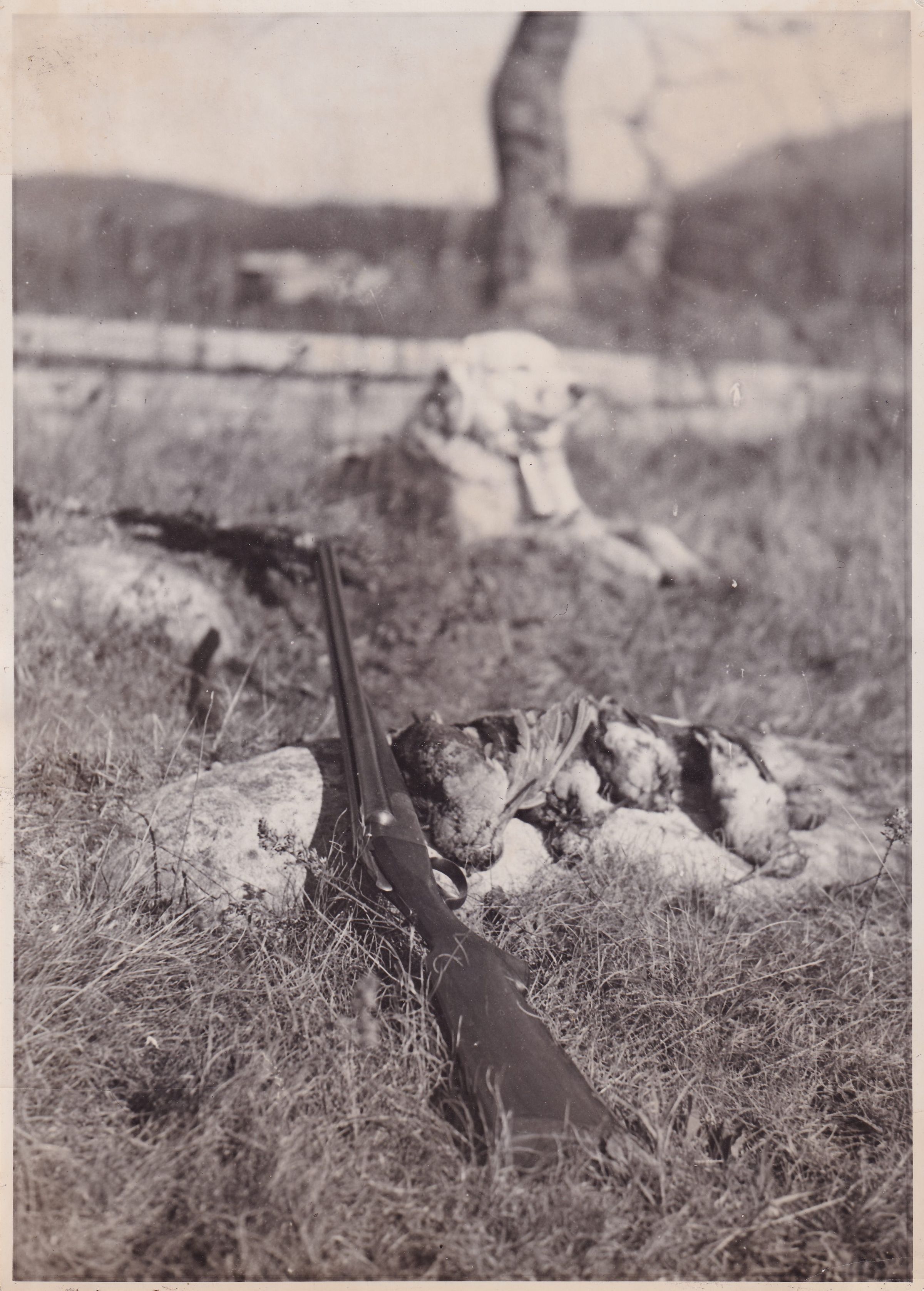 Black-and-White photograph of a number of dead game birds spread out on a rock with a rifle leaning next to them. A hunting dog can be seen in the background.
