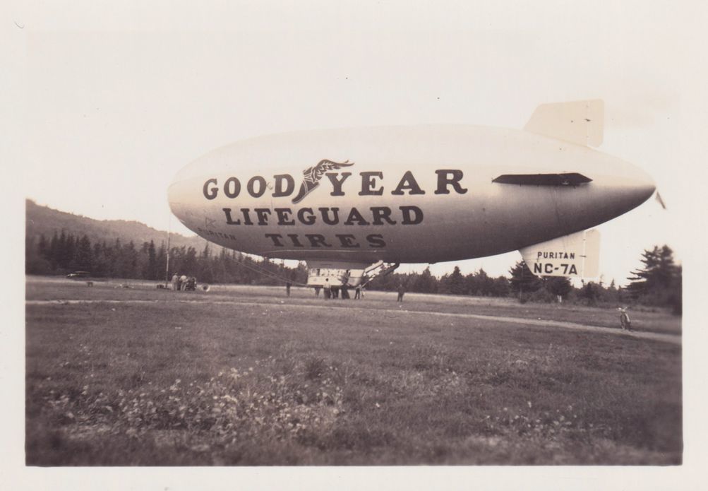 Black-and-White photograph of a Goodyear Blimp docked above a field. Several people can be seen standing around the cockpit. Photograph was likely printed by Kollecker's Kodak and Gift Shop.