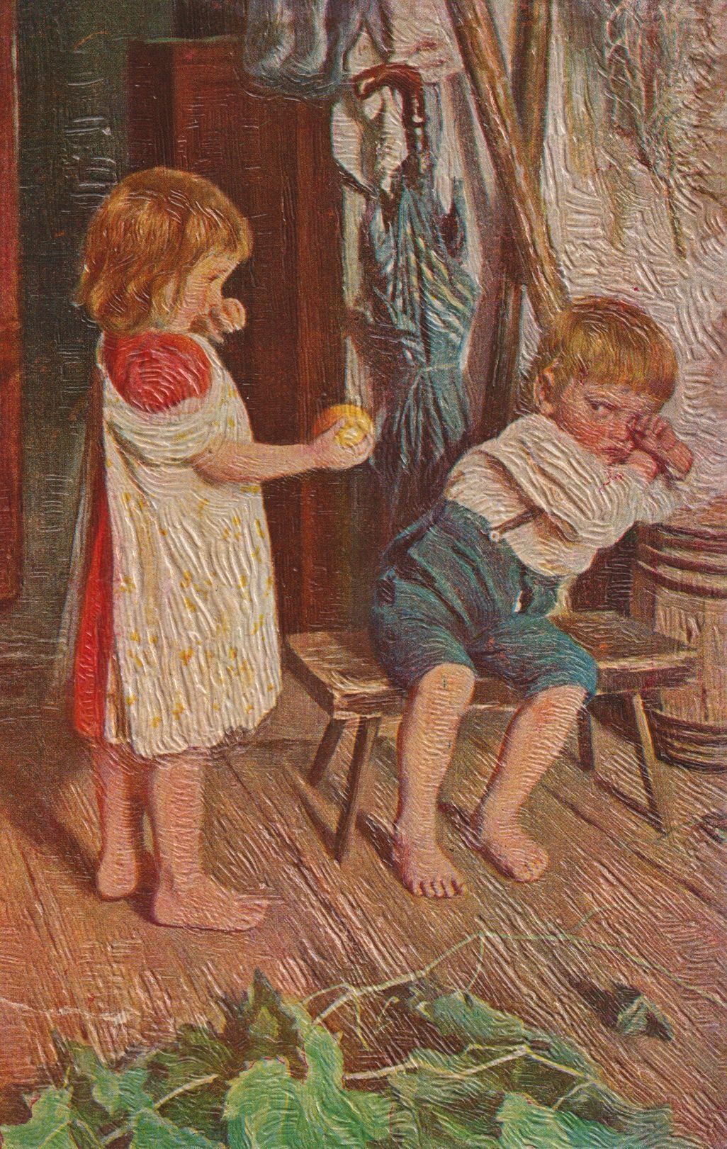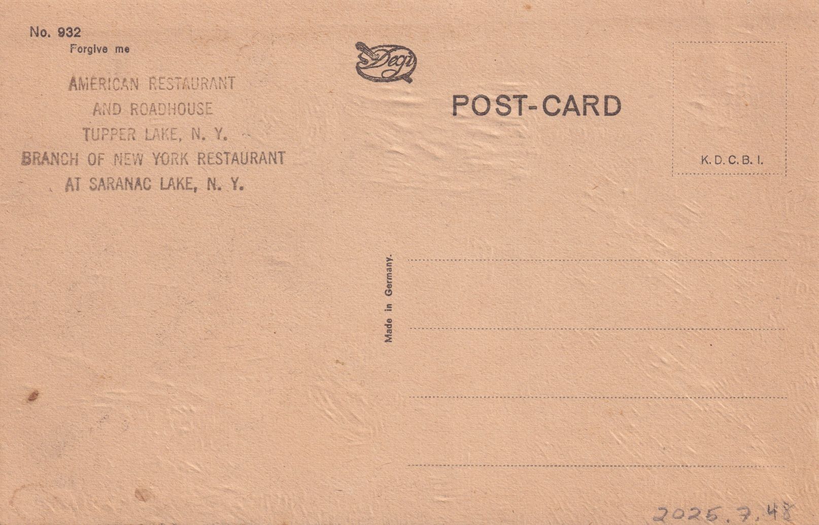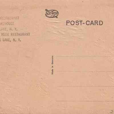 Color textured postcard showing an image of a child offering another child a piece of fruit. Printed caption on reverse reads, "Forgive me," and "American Restaurant and Roadhouse, Tupper Lake, N. Y, Branch of New York Restaurant at Saranac Lake, N.Y.," is stamped underneath. Made in Germany. Unused, divided back.Lexicon