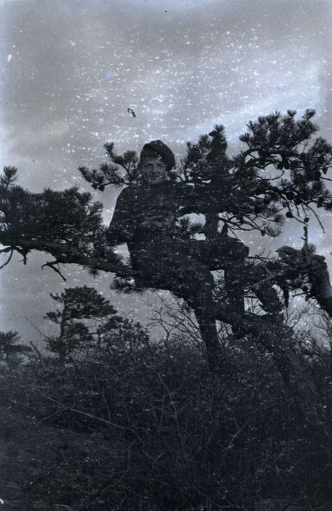 Negative of Henry Ives Baldwin sitting at the top of a tree. Most likely taken by Mary Ives Baldwin. This item is not fully cataloged but has been uploaded so the image is publicly available; if you would like us to prioritize cataloging this item, please contact the HSL Collections team.