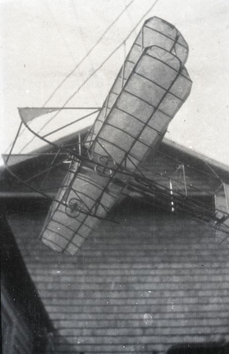 Negative of a model glider hanging from the side of the Baldwin House. Most likely taken by Mary Ives Baldwin. This item is not fully cataloged but has been uploaded so the image is publicly available; if you would like us to prioritize cataloging this item, please contact the HSL Collections team.
