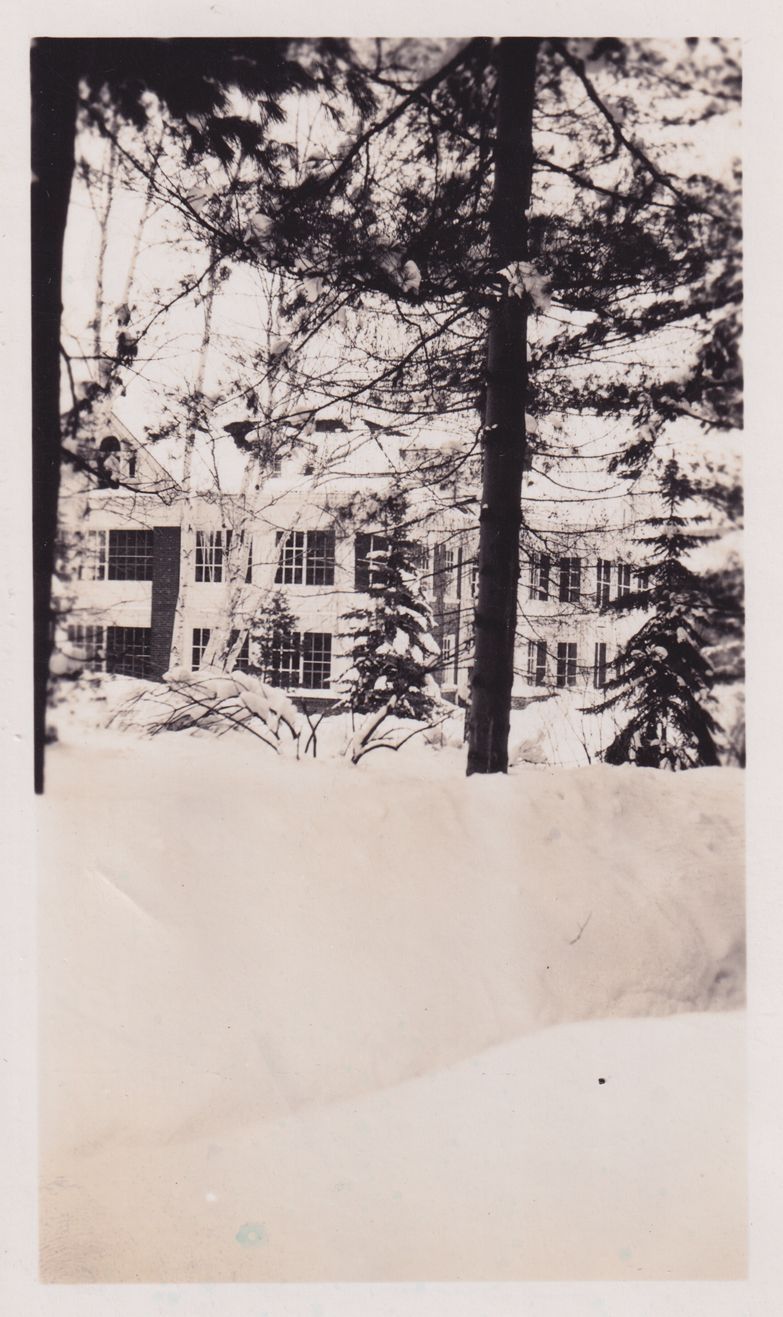Black and white photograph of the side of Reception Hospital in winter. There are large snow drifts in front of the photographer.