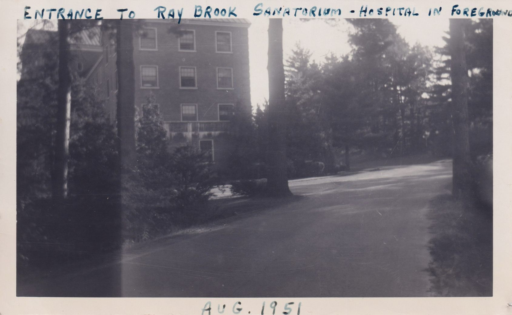 Black-and-White photograph of the driveway leading up to the New York State Hospital for Incipient Tuberculosis. The side of a brick building can be seen at left. Handwritten caption on front reads, "Entrance to Ray Brook Sanatorium - Hospital in Foreground. Aug. 1951." Print has decorative scalloped edges.