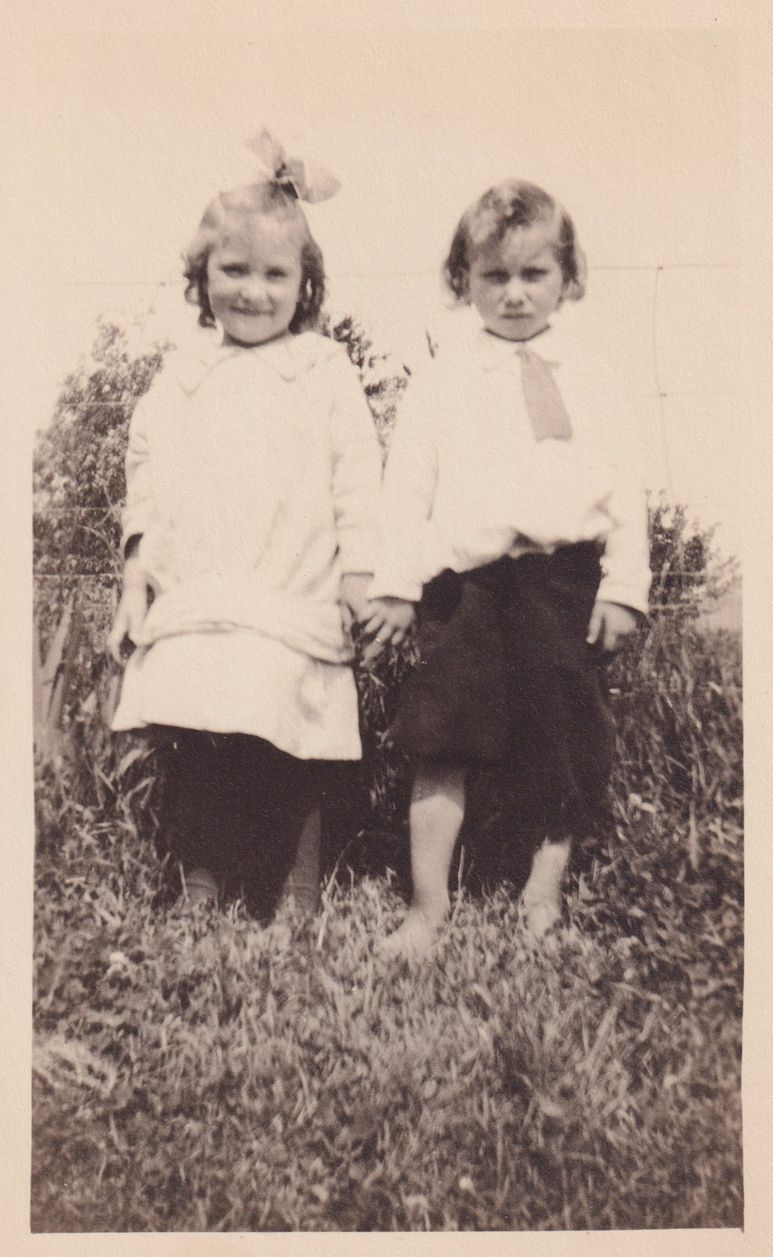Black-and-White photograph of two children standing outdoors. The photograph was likely printed by Kollecker's Kodak and Gift Shop.