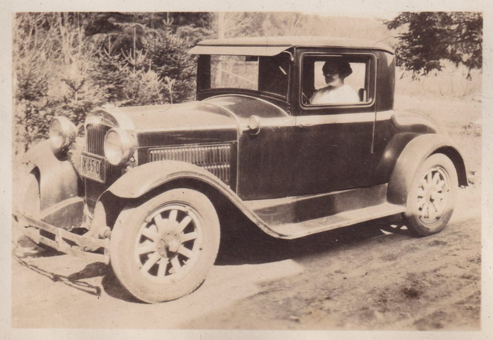 Black-and-White photograph of an unidentified woman seated in an early 1930s-style car. Part of album 2024.21.1, kept by Amy Jones and David Blair Jones c. 1930-1934.