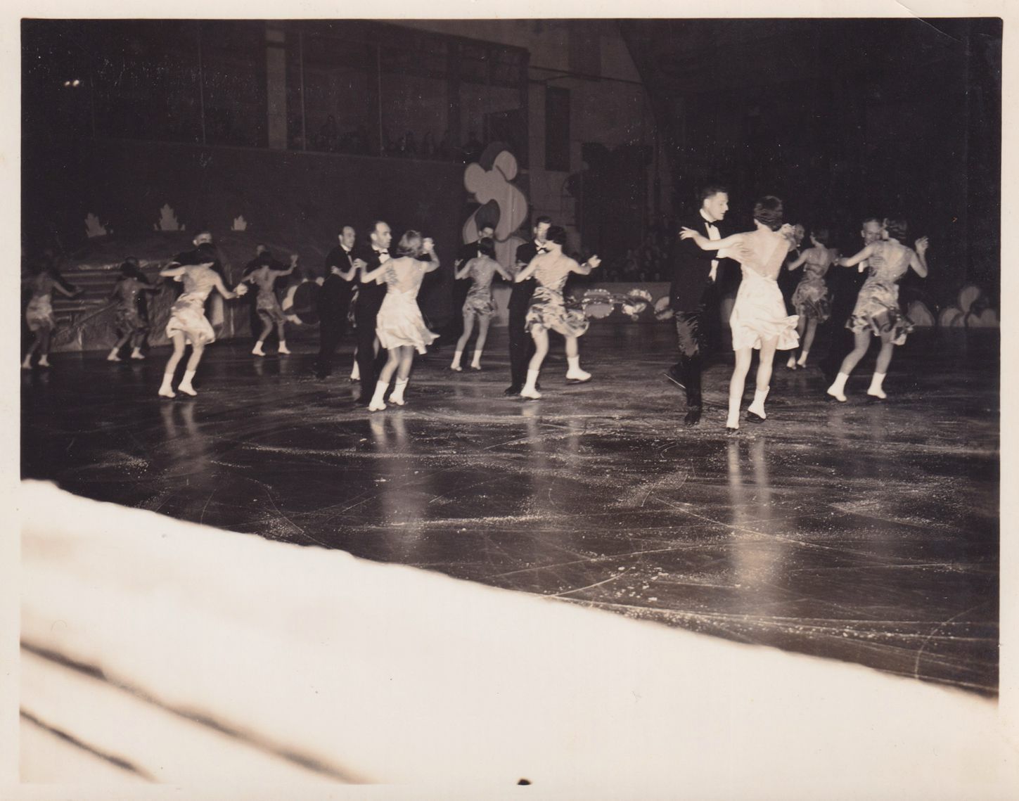Black-and-White photograph of couples dancing on ice skates on an indoor ice rink. Handwritten caption on back reads, "L. Placid, 1938." Photograph was likely printed by Kollecker's Kodak and Gift Shop.