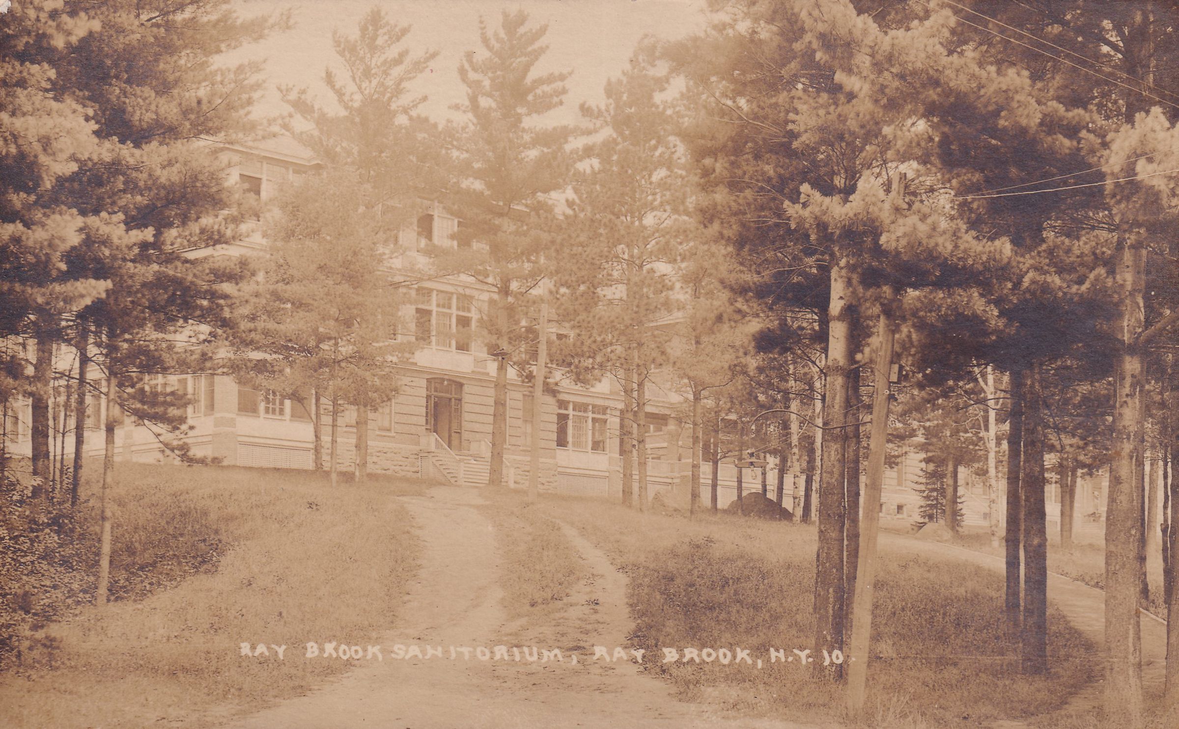Photograph postcard showing the Main Building at the New York State Sanatorium for Incipient Tuberculosis, AKA Ray Brook Sanatorium, as seen through the trees. Printed caption on front reads, “Ray Brook Sanitorium, Ray Brook, N. Y.” Unused, divided back.Subject Place