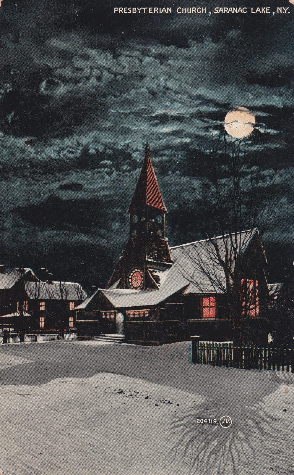 Color postcard showing the First Presbyterian Church in the moonlit snow. Printed caption on front reads, "Presbyterian Church, Saranac Lake, N.Y." Printed by the Valentine & Sons' Publishing Co., Ltd., New York. Used, divided back, postmarked Lake Clear, NY, June 26, 1908. Handwritten message on reverse reads, "June 26th, 1908. Lake Clear Jct., NY. Dear Brother & Sister, I received your most welcome letter some time ago. We are all well & I will write a letter soon. Your sister, [?]." Mailed to Mrs. George Ashland, Westminster, Mass.Subject Place