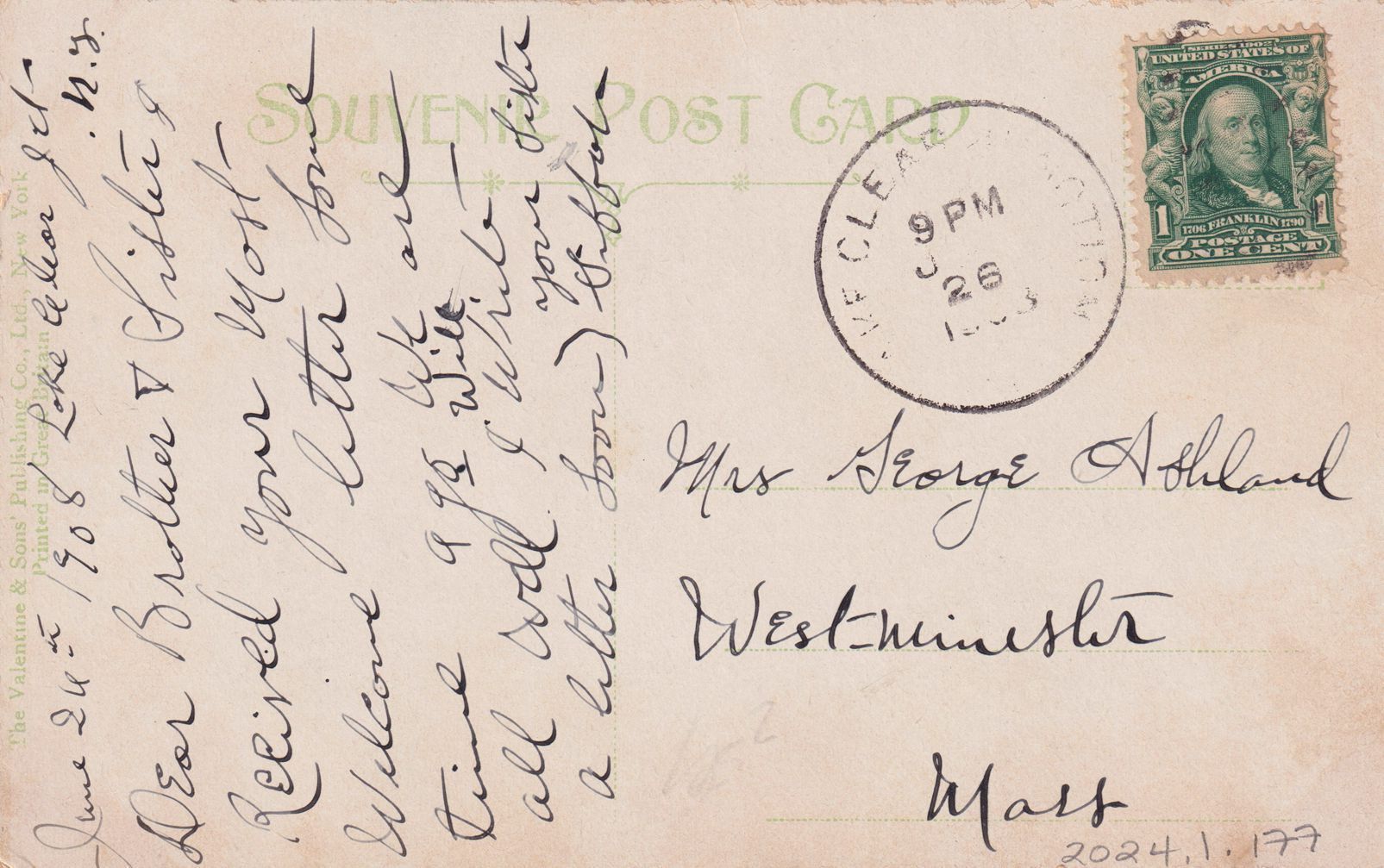 June 26th, 1908. Lake Clear Jct., NY. Dear Brother & Sister, I received your most welcome letter some time ago. We are all well & I will write a letter soon. Your sister, [?].Transcriber