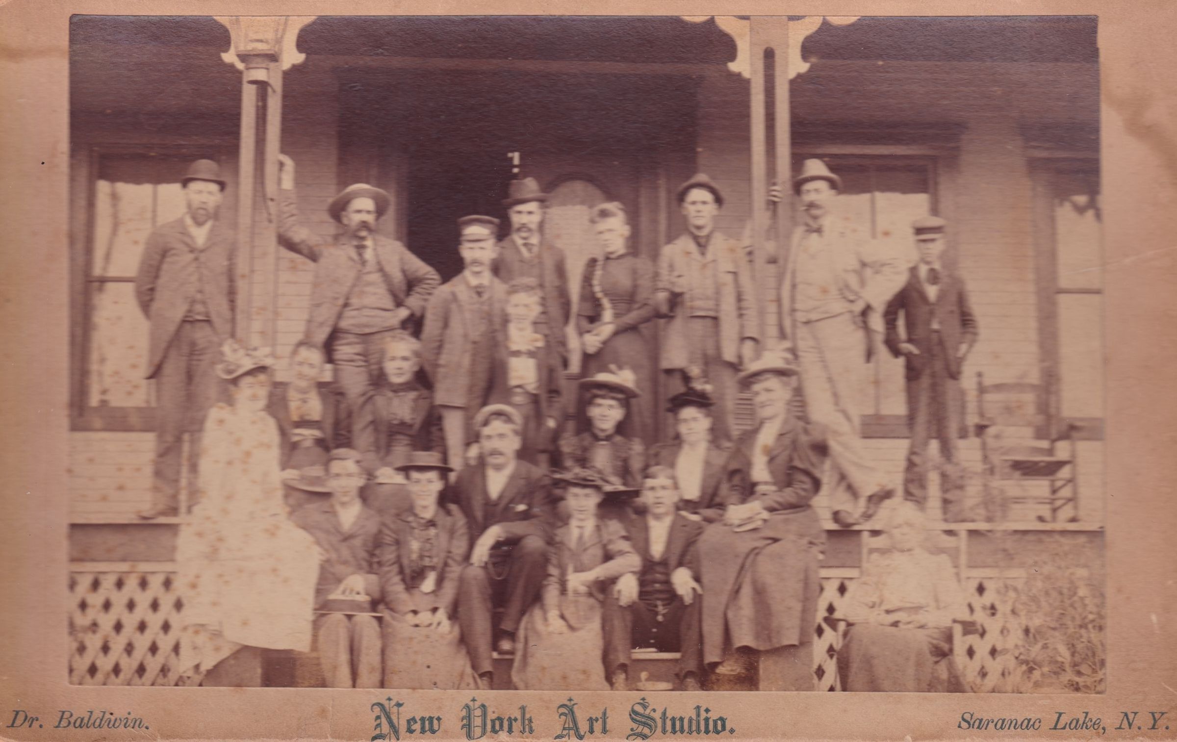 Black and white photograph of a group of people standing and sitting on the front porch and steps of a house. The photograph is attributed to the New York Art Studio, taken by Dr. Baldwin in Saranac Lake, N.Y.