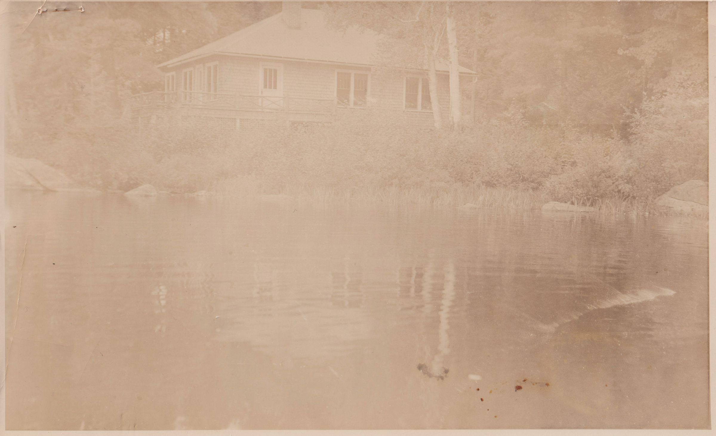 Black-and-White photograph of Spruce Cottage at Bartlett Carry Club, seen from the water. Was pinned to floor plan of building [2024.57.87].