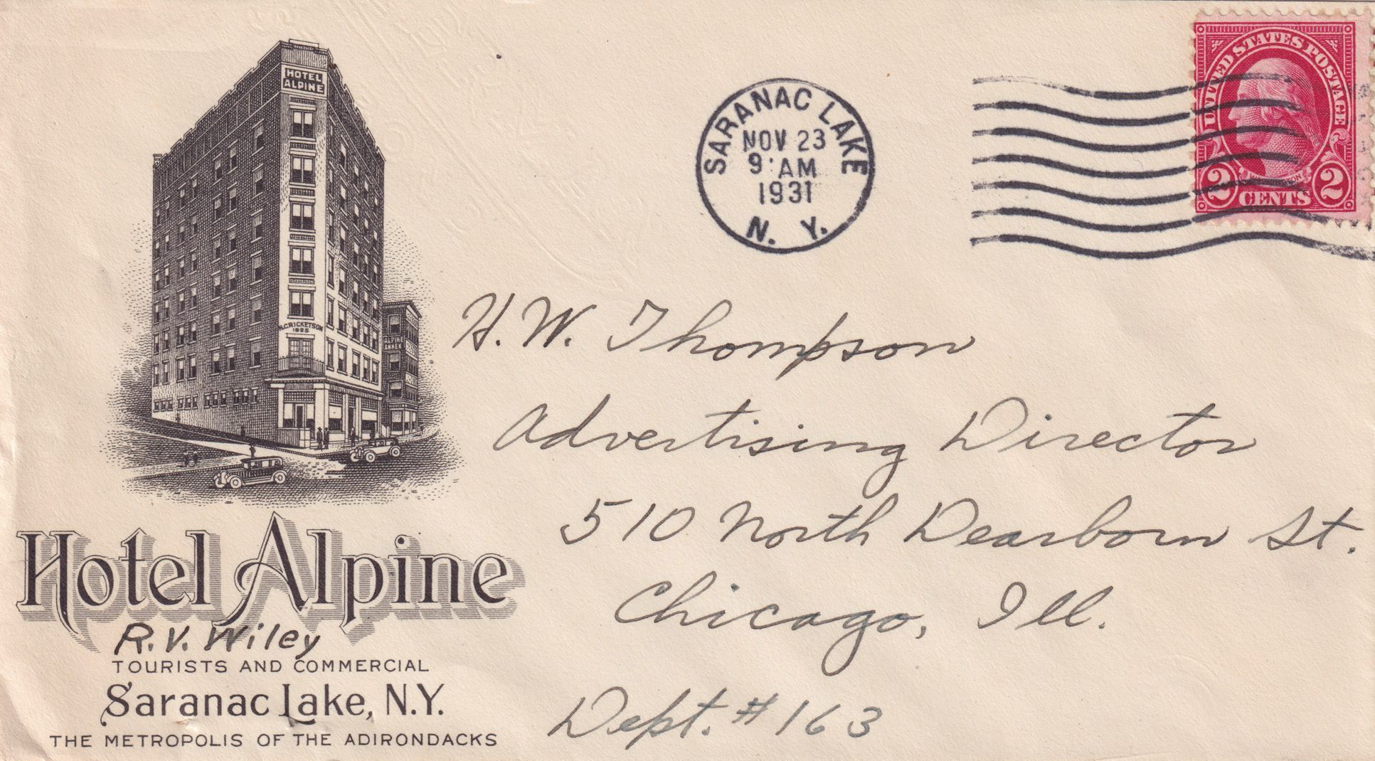 Envelope with Hotel Alpine branding. Has drawing of the hotel, with "Hotel Alpine, Tourists and Commercial, Saranac Lake, N.Y., The Metropolis of the Adirondacks." "R. V. Wiley," is handwritten under the hotel name. Mailed to H. W. Thompson, Advertising Director, 510 North Dearborn St., Chicago, Ill., Dept. #163. Postmarked Saranac Lake, November 23, 1931. Envelope has been cut open along top edge, no letter enclosed.Collection