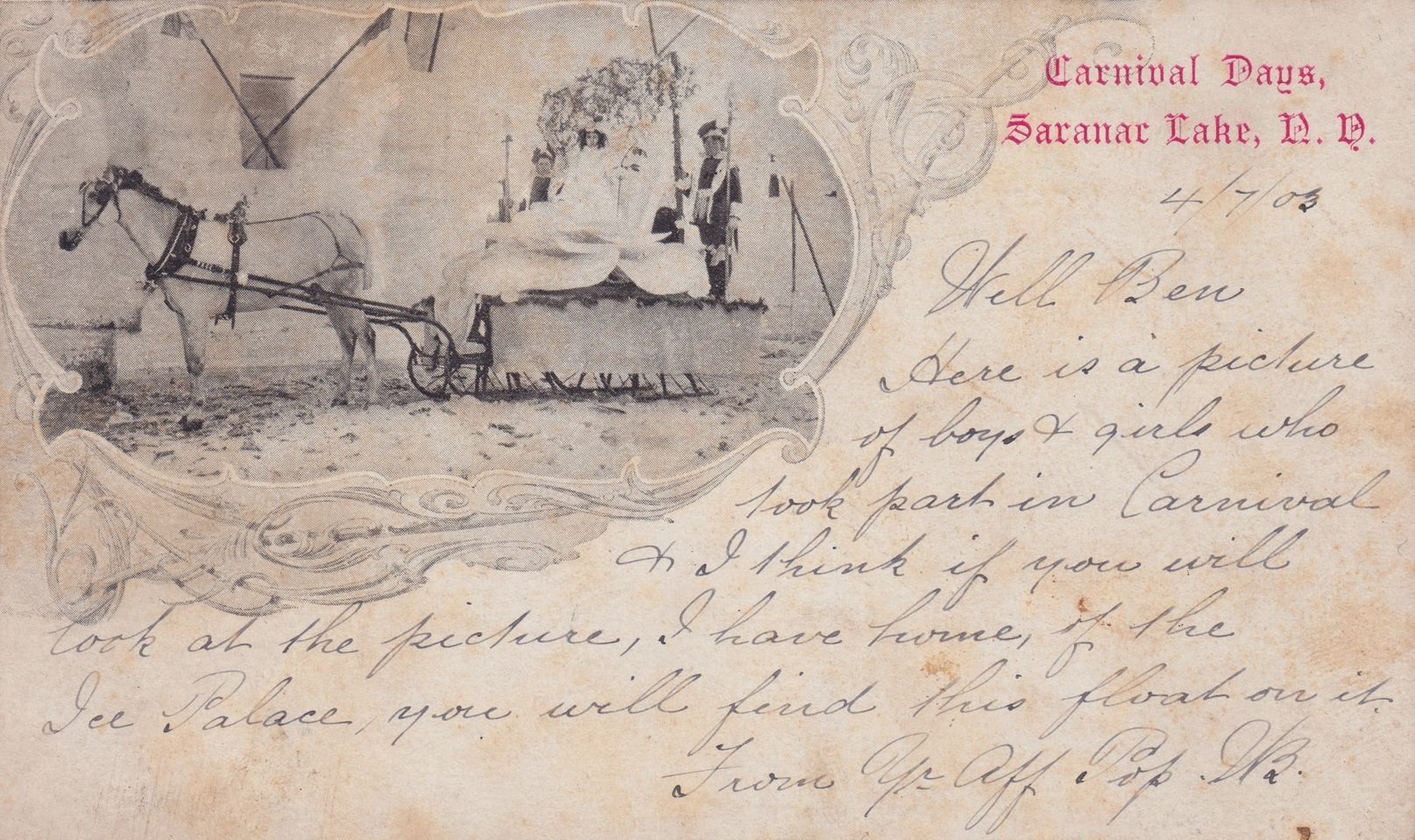 Black-and-White postcard with image of a Winter Carnival float in front of the ice palace. The float is drawn by a white horse, and several children in "royal" garb are standing on the sleigh. Printed caption on front reads, "Carnival Days, Saranac Lake, N. Y." No printer's mark. Used, Private Mailing Card, large space on front for message, postmarked Saranac Lake, April 7, 1903.