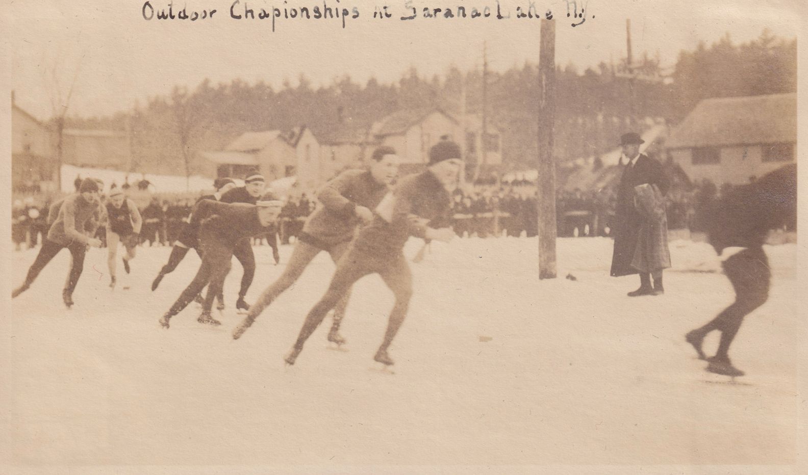 Black-and-white photograph of at least eight men competing in an outdoor skating competition at Pontiac Bay. There is a man standing in the middle of the skating loop, likely a referee or judge. "Outdoor Chapionships [sic] at Saranac Lake NY." is written in ink at the top of the photograph.