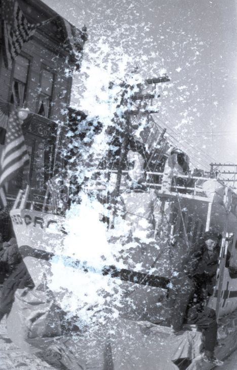 Negative of a Winter Carnival float in the shape of a boat, full of Red Cross nurses. There is a piece of paper stuck to the surface of the negative that is obscuring parts of the image. Most likely taken by Mary Ives Baldwin. This item is not fully cataloged but has been uploaded so the image is publicly available; if you would like us to prioritize cataloging this item, please contact the HSL Collections team.