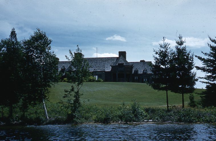 Color Kodachrome slide showing an unidentified camp seen from Upper Saranac Lake. Handwritten caption on front reads, "Estate at South End of Upper Saranac." From a group of vacation slides taken by an unidentified family.
