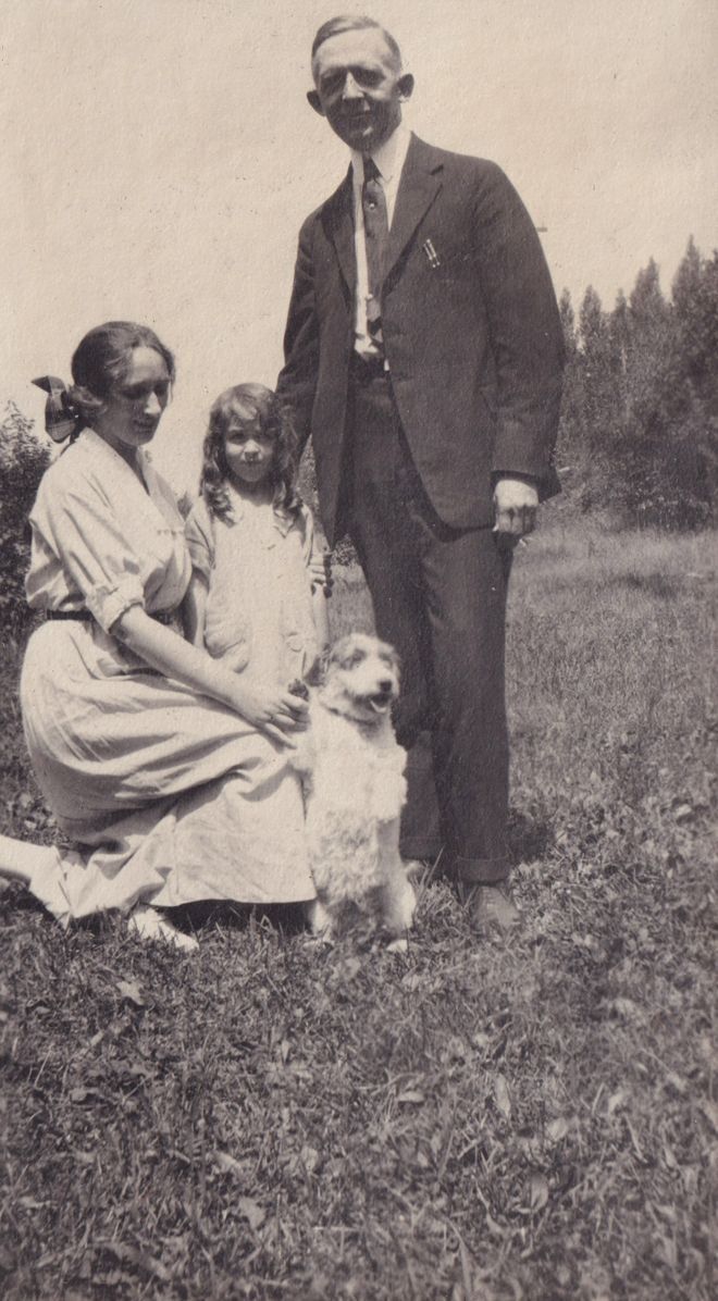 Black and white photograph of a small family outside. There is one man standing and one woman kneeling next to a young child and dog.
