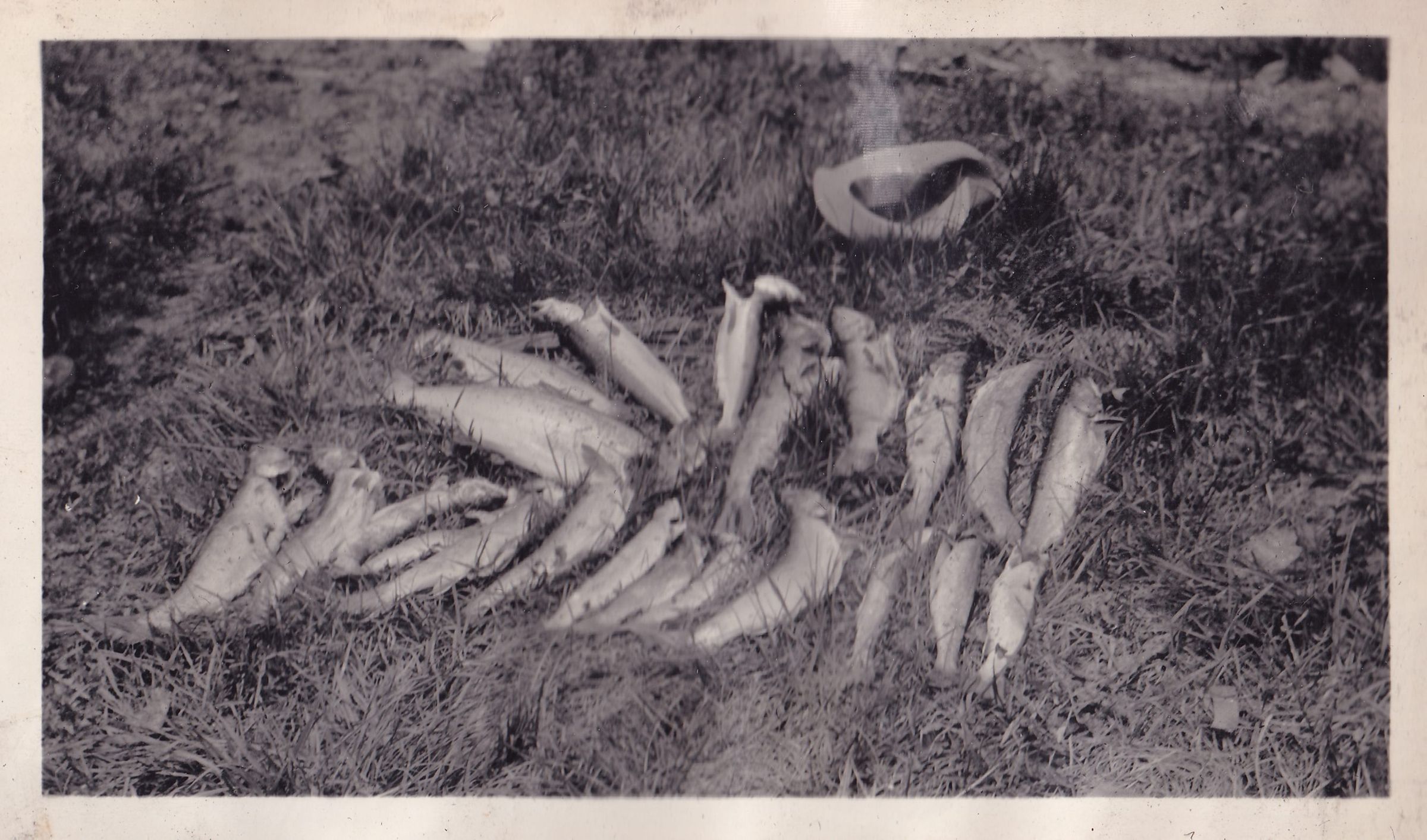 Black-and-white photograph of salmon and brook trout laid out in the grass. Handwritten on page is, "Fishing trip at Maine May 1937. Land locked salmon and brook trout three days fishing for six men. Pictures by Dr. Haskins."