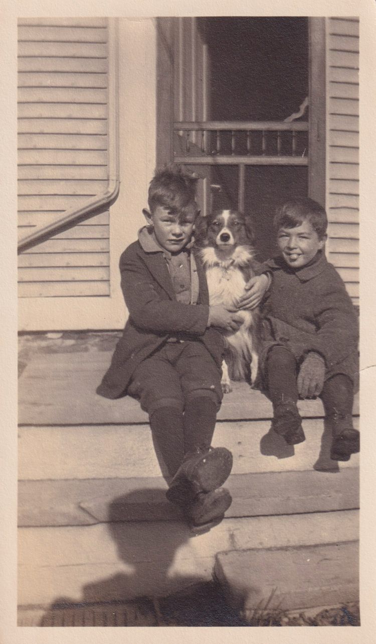 Black-and-White photograph of two boys seated on the front steps of a house. There is a dog between them, and one of the boys is sticking his tongue out. The shadow of the photographer can be seen on the ground in front of them. The photograph was likely printed by Kollecker's Kodak and Gift Shop.