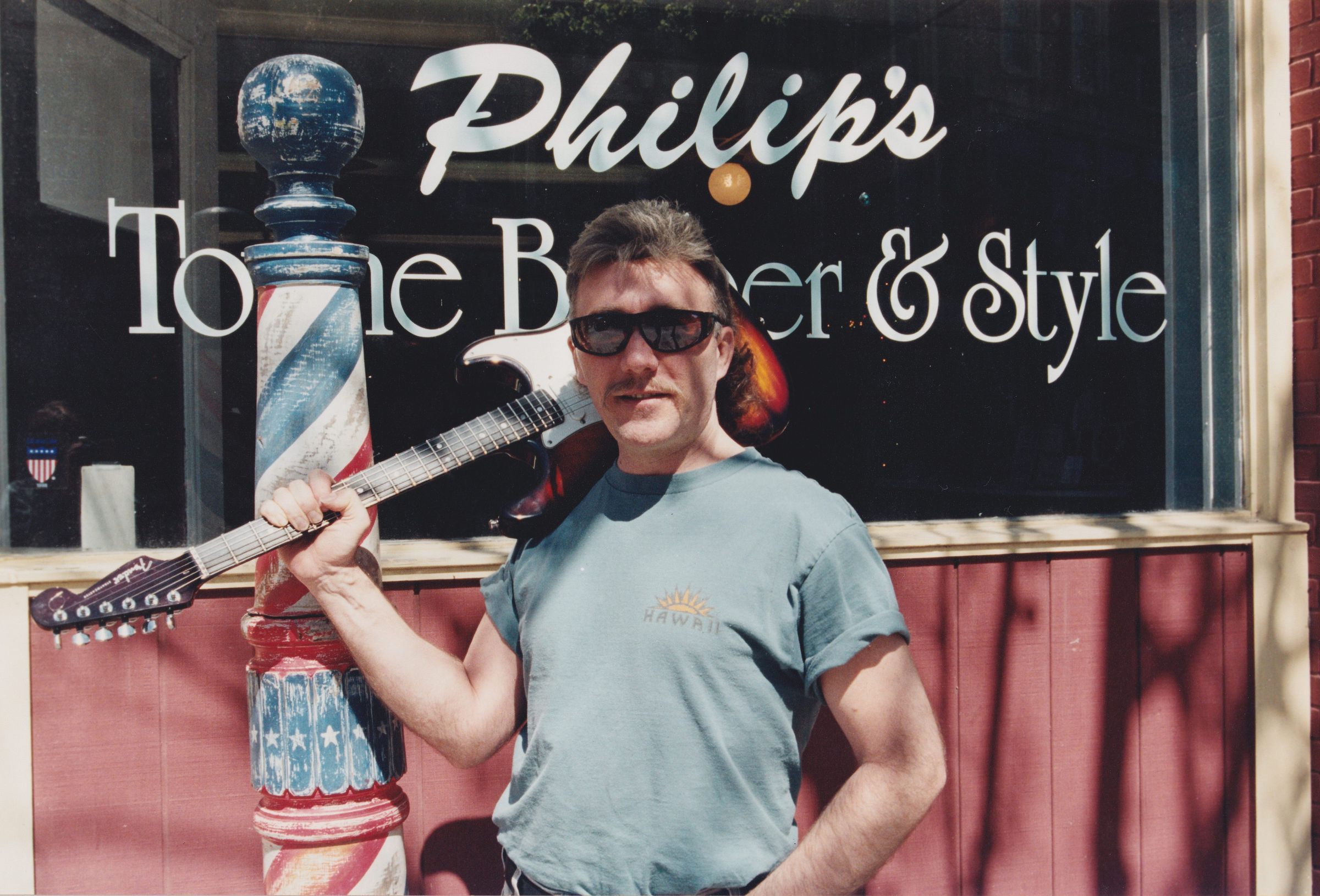 Color photograph of Philip Balisciano in front of the shop window of his business, Philip's Towne Barber & Style. Portrait taken by Mary Lou Hanpeter Banks as part of her Soul Proprietor exhibition.
