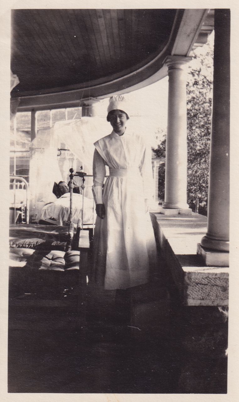 Black and white photograph of a nurse standing on a cure porch. There are hospital beds on the porch behind her, one with a patient smiling at the camera in it. There are Greek-style columns between the ceiling and edge of the porch.