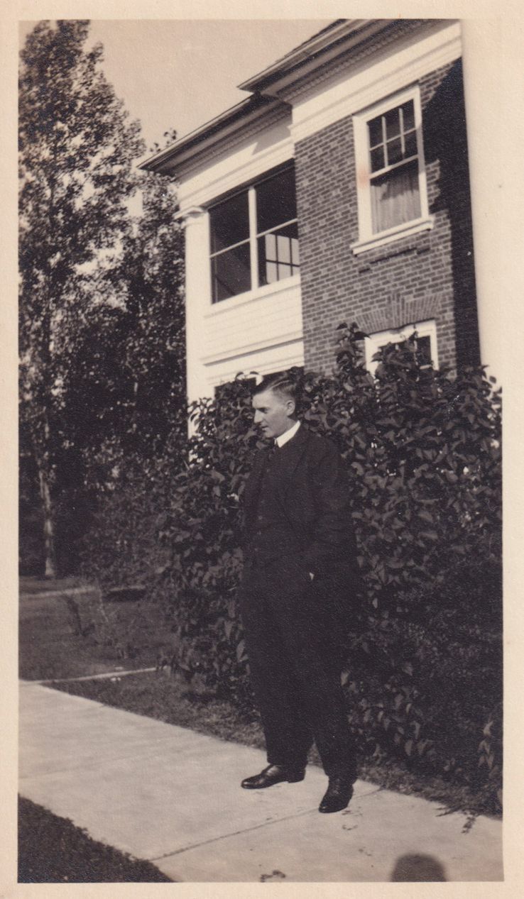 Black-and-White photograph of an unidentified man standing on the sidewalk outside of the west end of Reception Hospital. Cure porches are visible behind him. The photograph was likely printed by Kollecker's Kodak and Gift Shop.