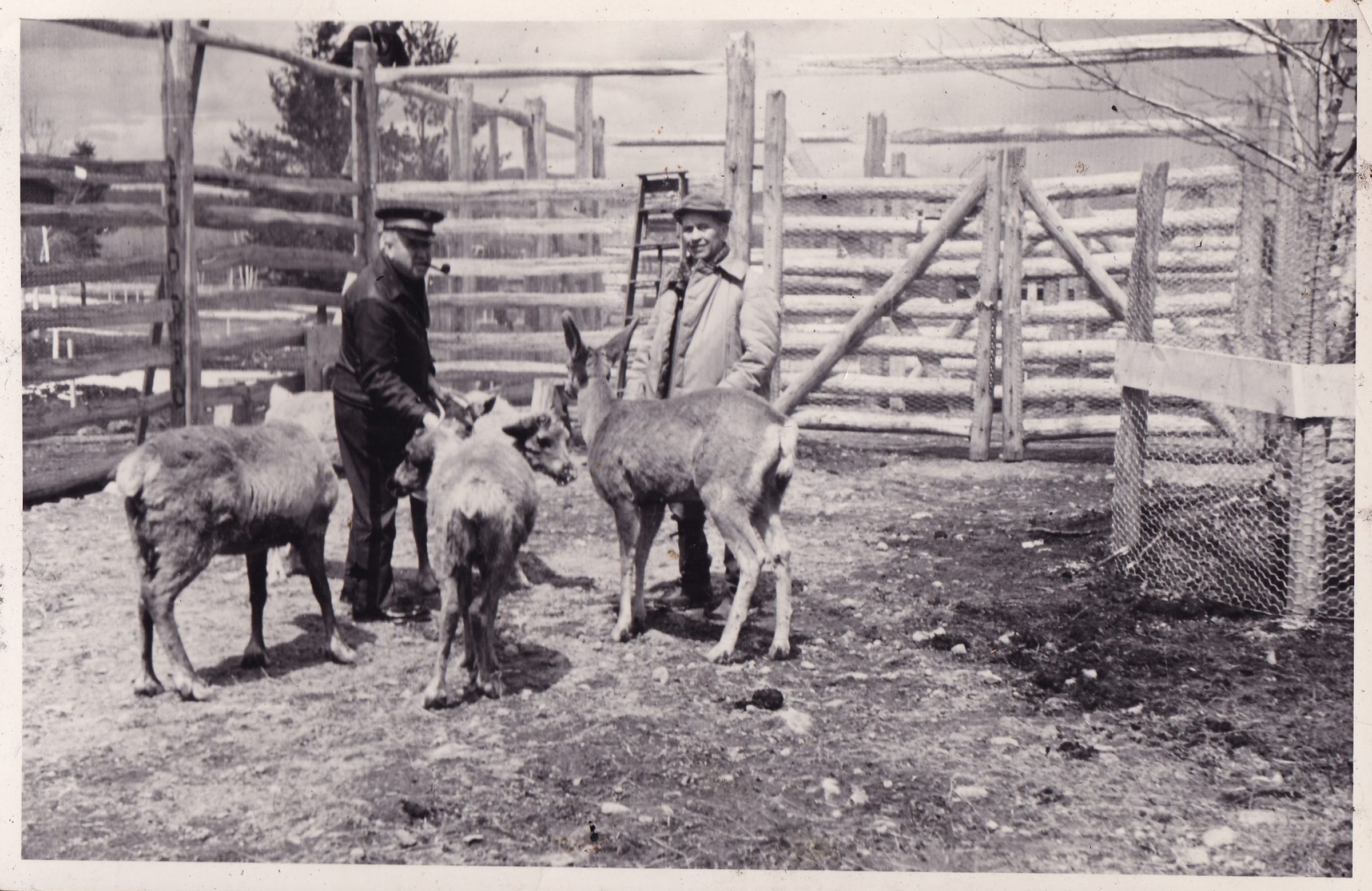 Black-and-White photograph of two men feeding reindeer in a pen with a wooden fence.