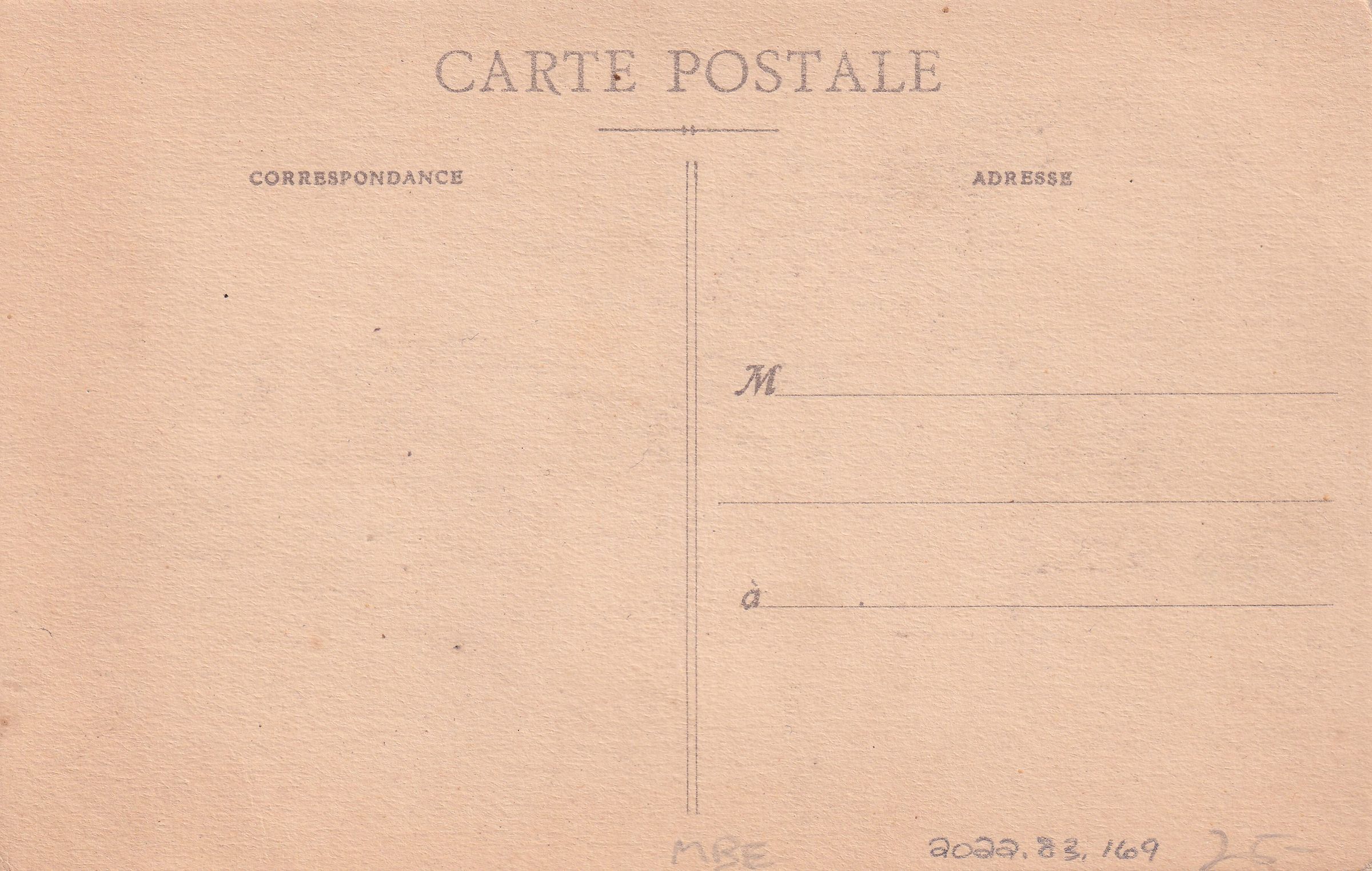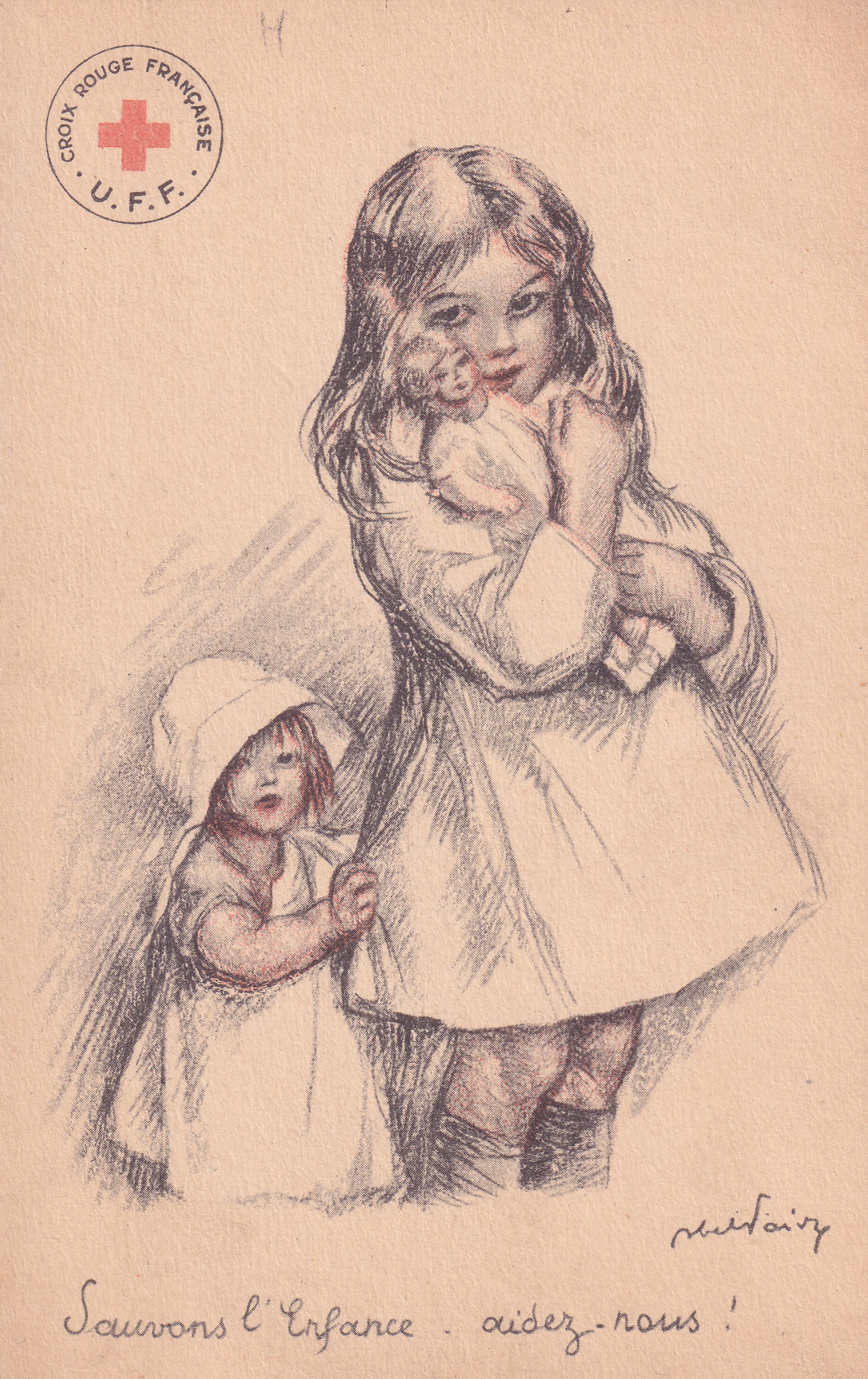 Postcard with drawing of two small children. One of them is holding a doll. Printed caption on front reads, “Sauvons L’Enfance Aidez-Nous!” Produced by the Croix Rouge Française. Unused, divided back.Collection