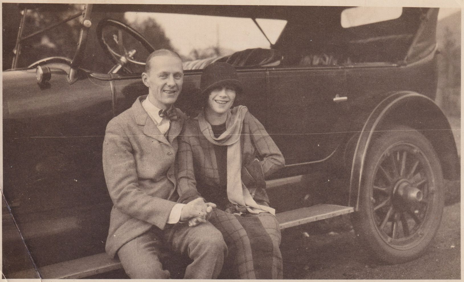 Black-and-White photograph of a man and a woman sitting on the running board of an early automobile. They are holding hands. Handwritten note on reverse reads, "Leslie W. Hayes, Oct. 15, 1924, Lake Placid, NY near Ray Brook."Photograph Details