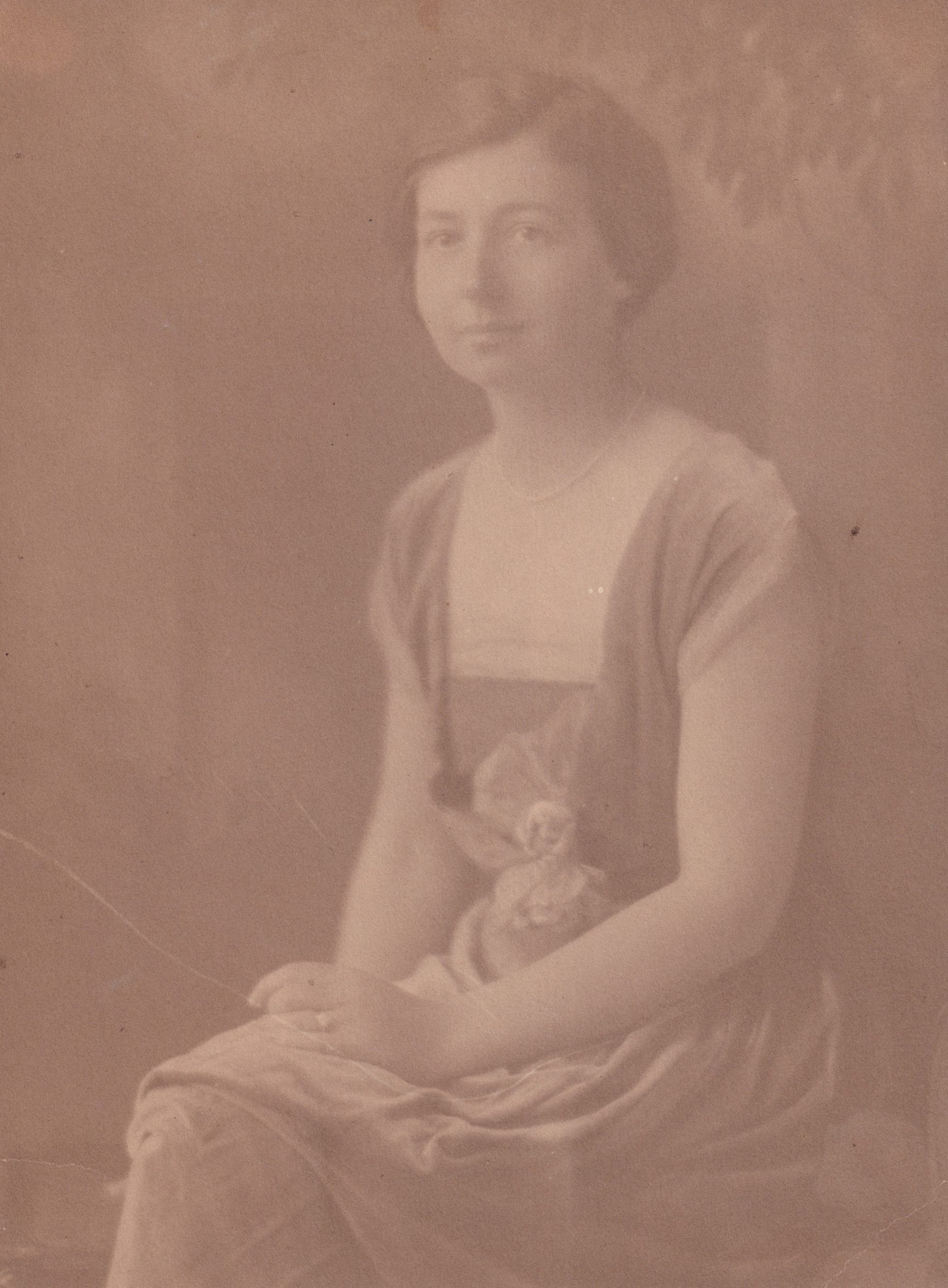 Black-and-White studio portrait of Carol Douglas. Sticker on reverse reads, "The Misses Selby, 628 Fifth Avenue."