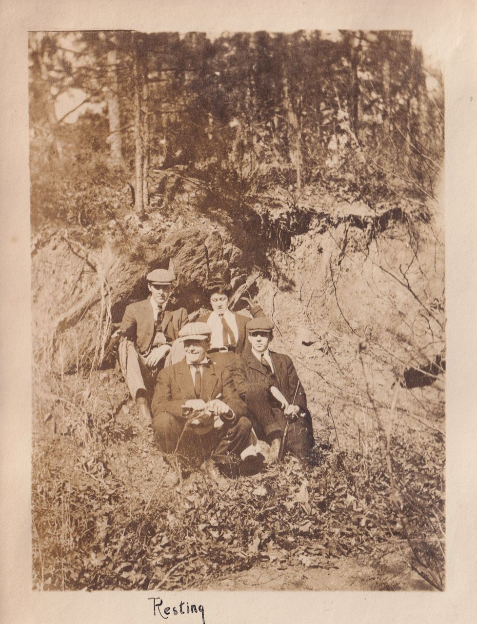 Black-and-white photograph of one woman and three men sitting on the ground in a wooded area. There are many fallen leaves on the ground around them. "Resting" is written in ink beneath the photograph.
