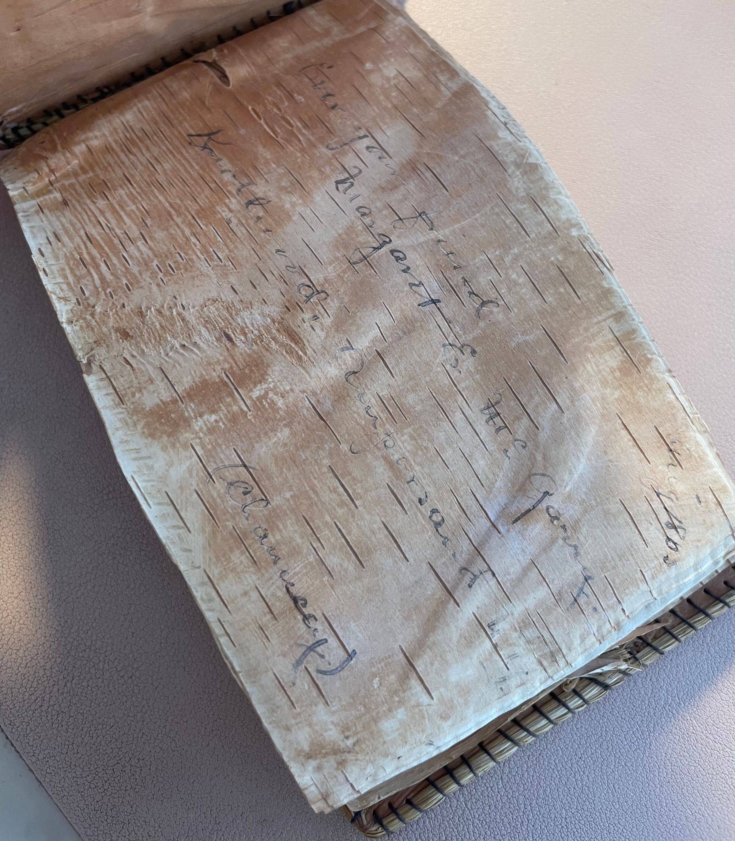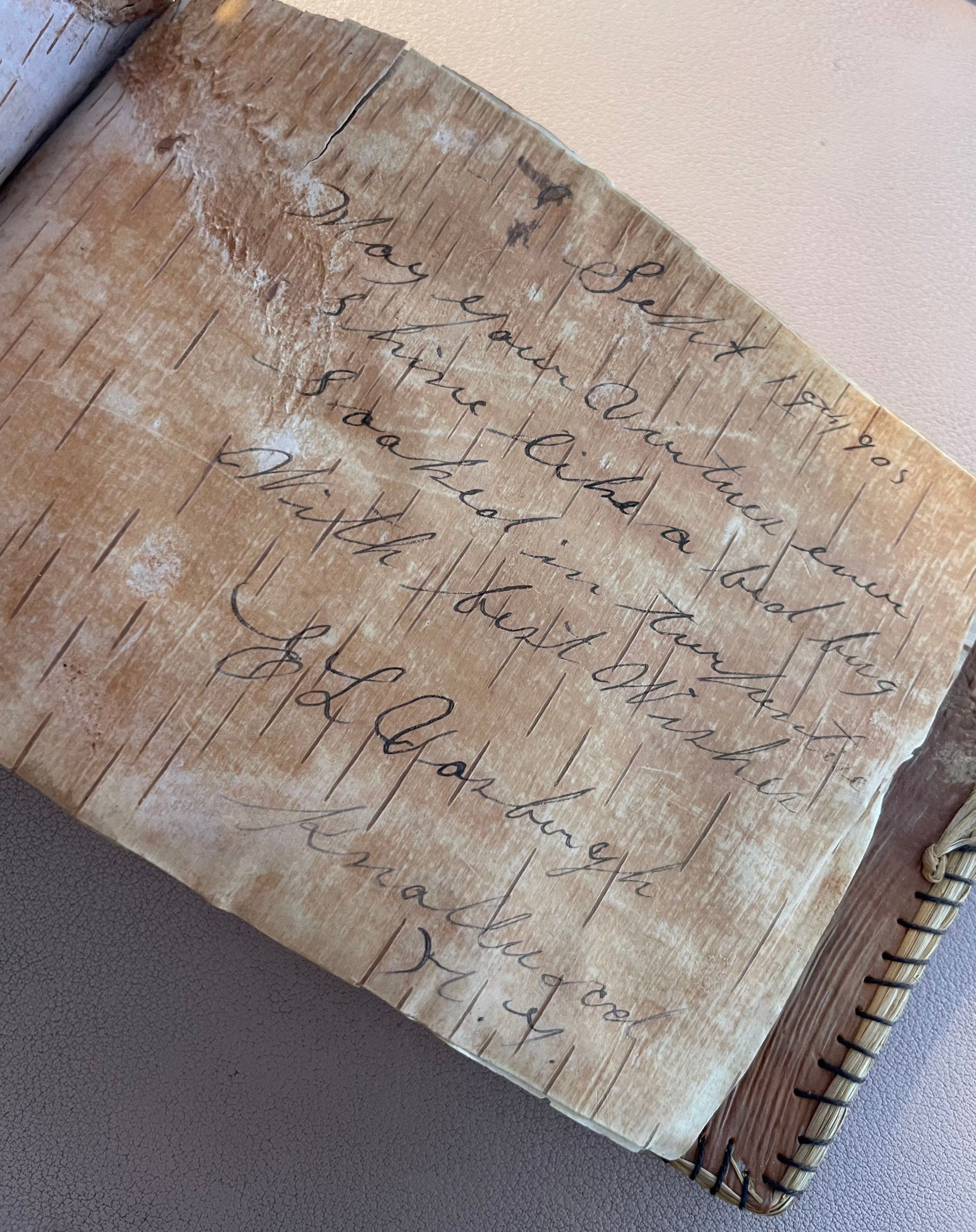 Autograph album made of birch bark. Covers have punched flower design and stitched edges, and front cover has handwritten "Saranac Lake, N.Y." on edge. Pages inside album are made of birch bark as well. Covers appear to have been stitched/edged with some kind of plastic thread, but it has largely disintegrated. Album pages are made out to May, and many mention Knollwood Club. Primarily dated August and September 1905. Signatures include: Margaret E. McGarry, Ruth Swinyer, Josey Pasho, Maggie Barnes, Agnes Barnes, M. McCarthy, Grace Dale, E. L. Vosburgh, Mrs. E. L. Vosburgh, and Mabel Benoit.Collection