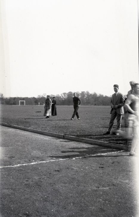 Negative of an outdoor track or cross county race. One blurry racer is running on a dirt track with a few spectators standing on grass at the sideline. Most likely taken by Mary Ives Baldwin. This item is not fully cataloged but has been uploaded so the image is publicly available; if you would like us to prioritize cataloging this item, please contact the HSL Collections team.